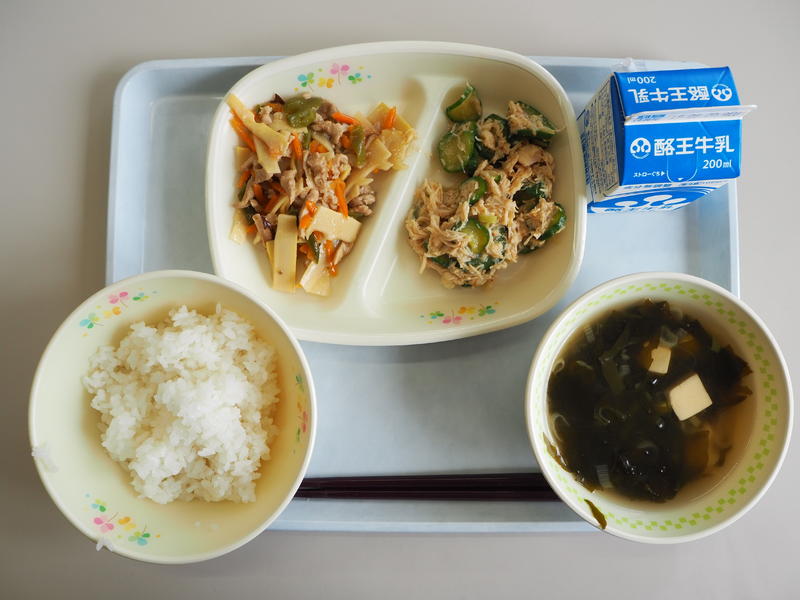 ごはん 牛乳 チンジャオロース バンバンジーサラダ 中華わかめスープ