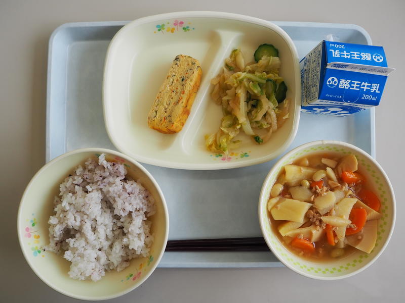 ゆかりごはん 牛乳 具だくさん玉子焼き キャベツの浅漬け じゃがいものそぼろ煮
