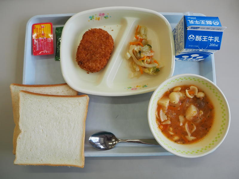 食パン 牛乳 イチゴ&マーガリン 野菜コロッケ オニオンサラダ ミネストローネ