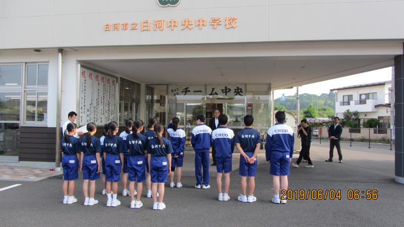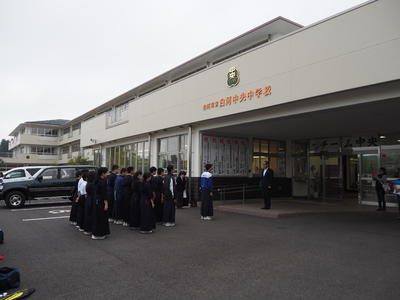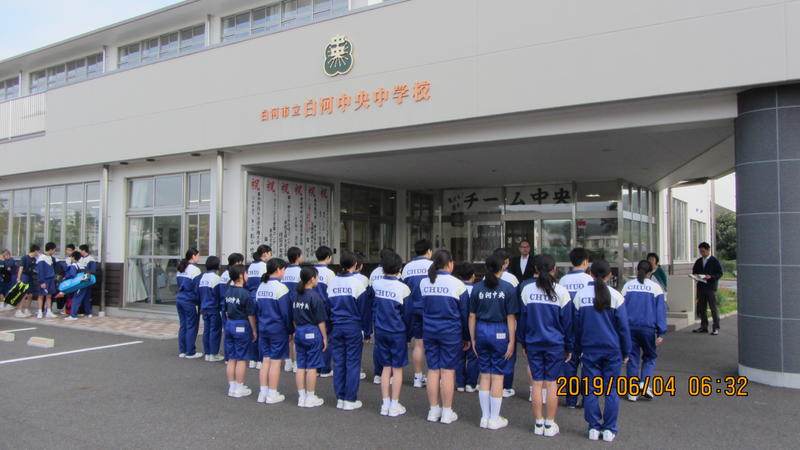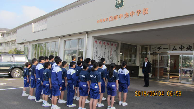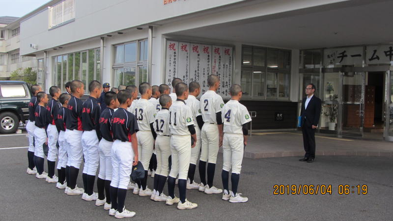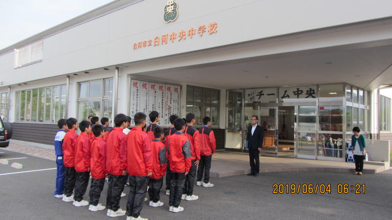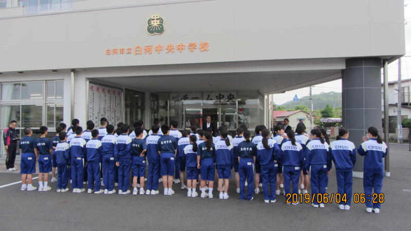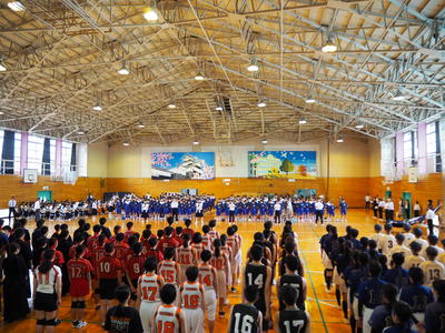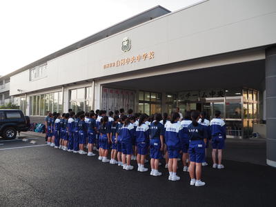 県南中体連総合大会へ向けた出発式が行われています。