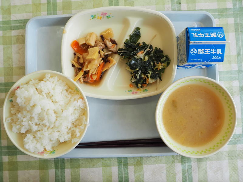 ごはん 牛乳 豚肉と竹の子の炒め物 わかめとツナの和え物 なめこ汁