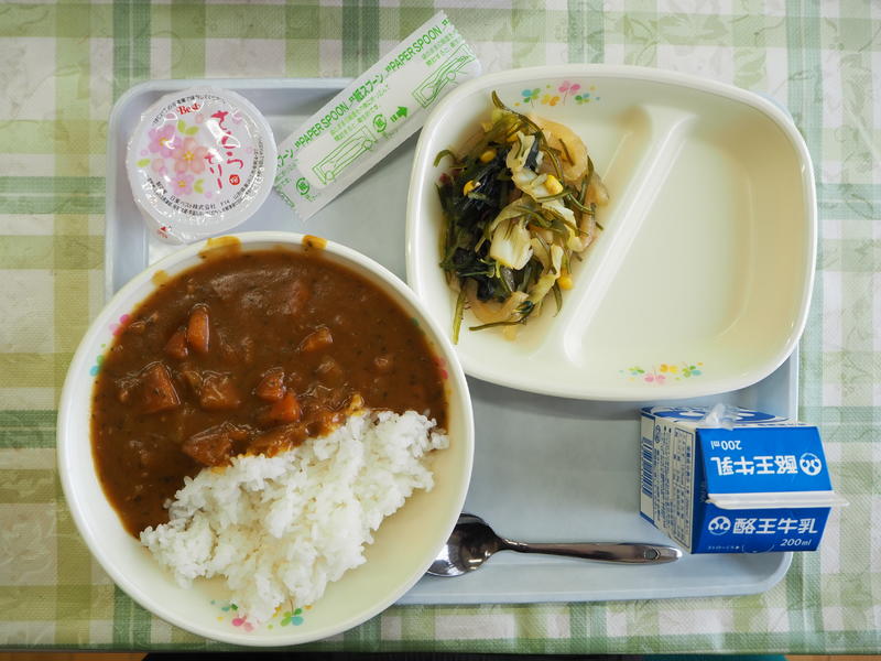 チキンカレーライス 海藻サラダ 牛乳 さくらゼリー