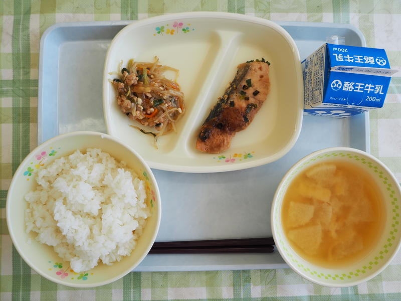 ごはん 牛乳 さけの三味焼き もやしのひき肉炒め じゃがいものみそ汁