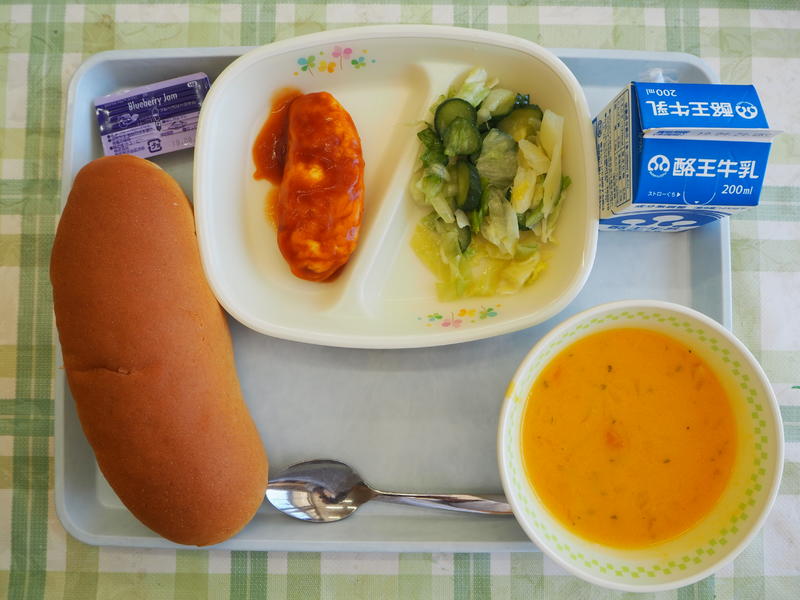 コッペパン 牛乳 ブルーベリージャム オムレツデミソースかけ レタスサラダ ポタージュ