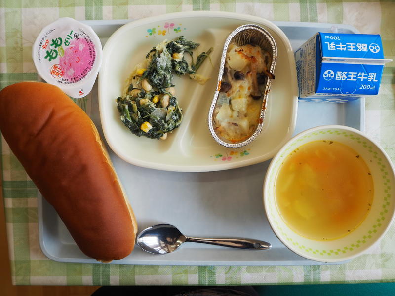 黒糖パン 牛乳 ポテトのチーズ焼き ほうれん草サラダ 白菜スープ ももゼリー