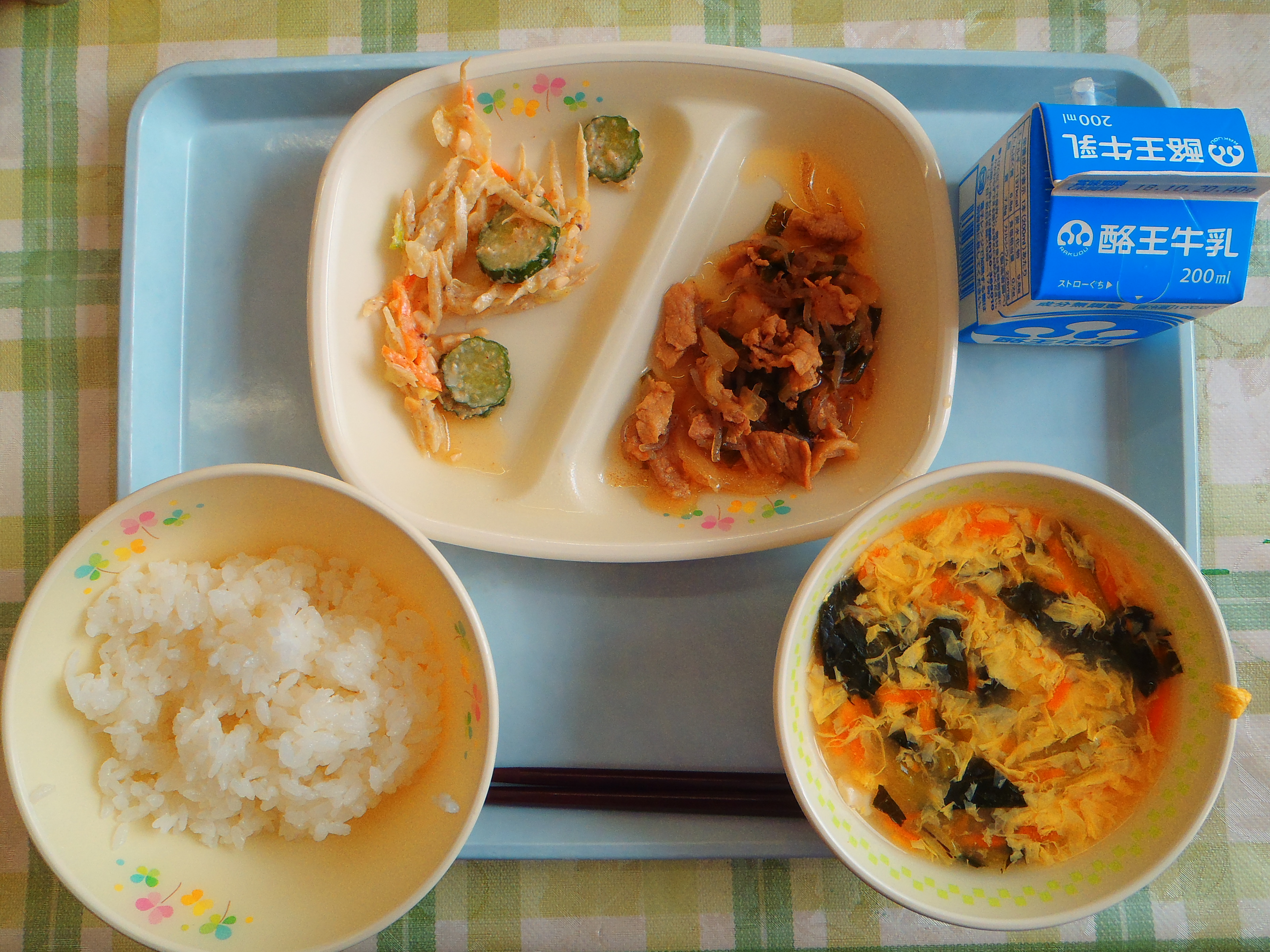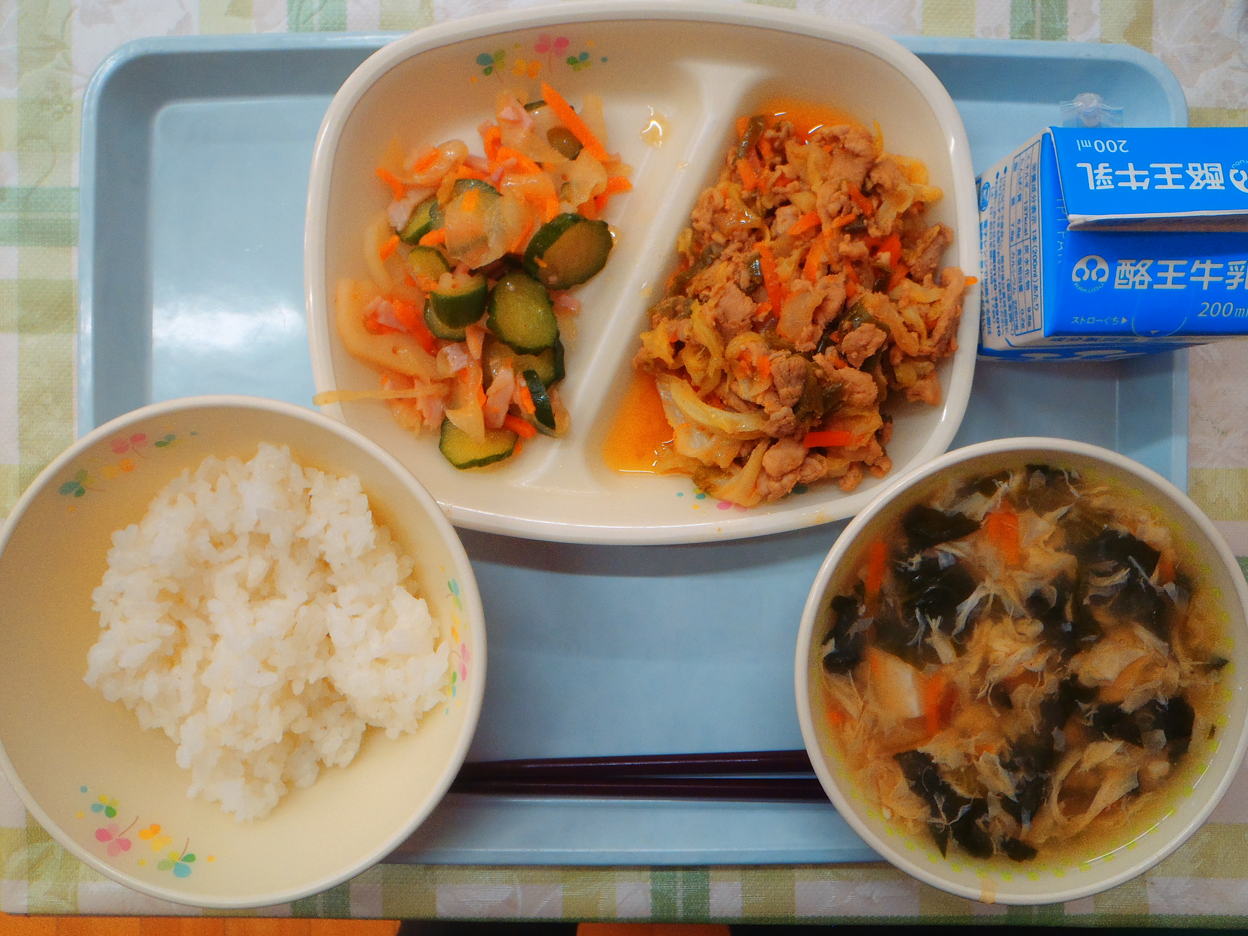 ごはん かきたま汁 野菜入り焼肉 れんこんサラダ 牛乳