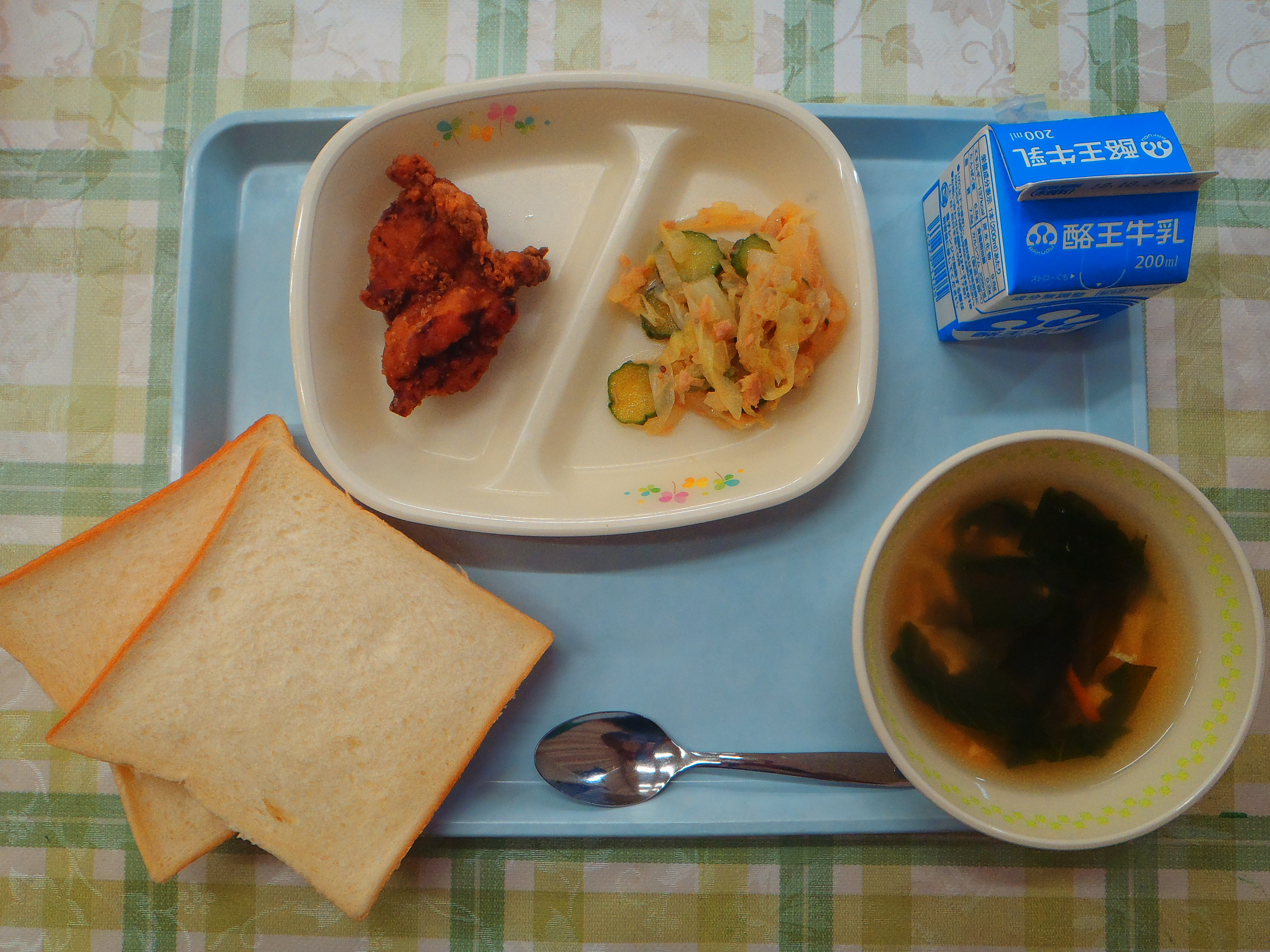 食パン 卵スープ 大根サラダ 鶏の唐揚げ リンゴジャム 牛乳