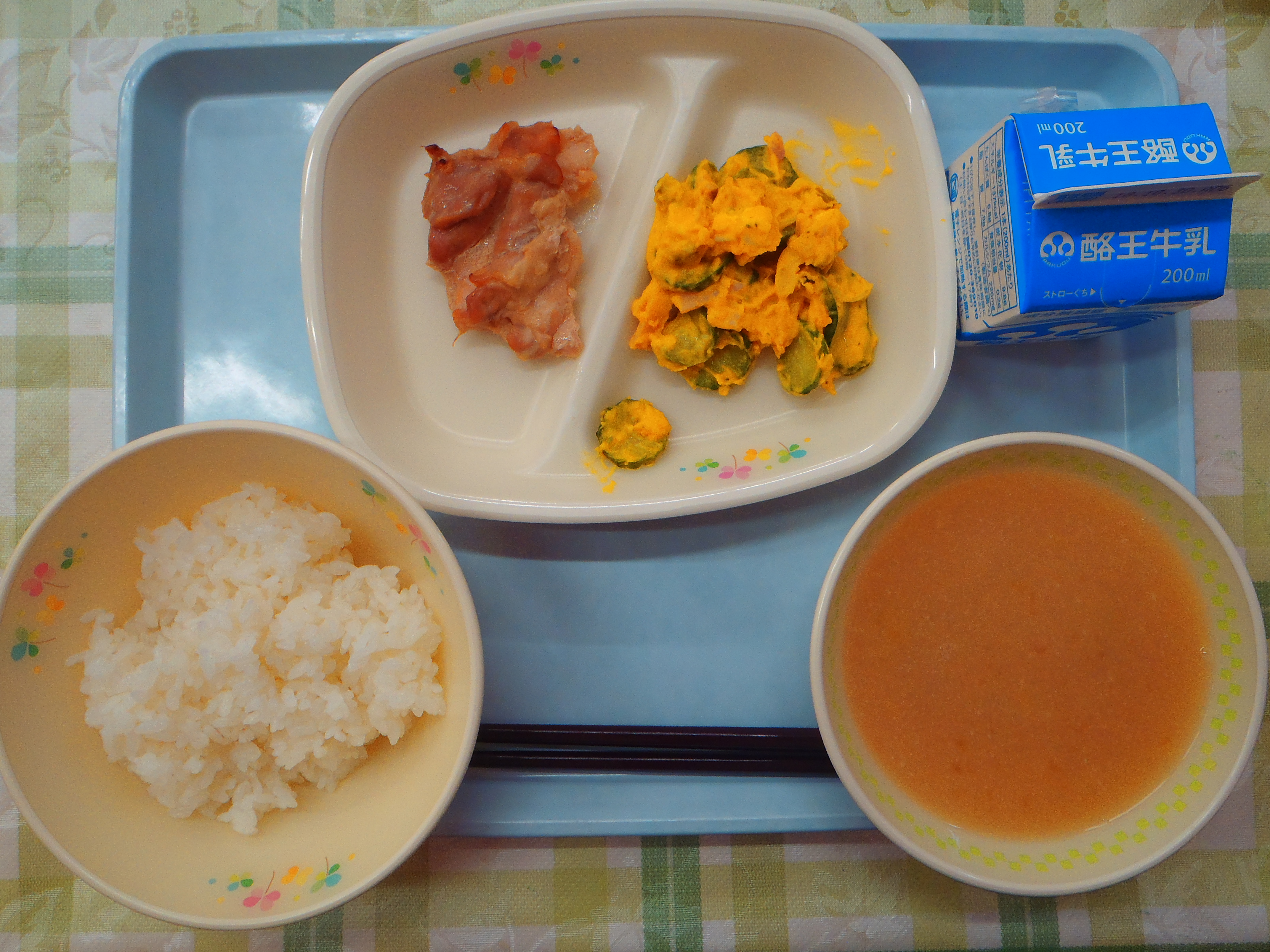 ごはん なめこ汁 かぼちゃサラダ 鶏肉の照り焼き 牛乳