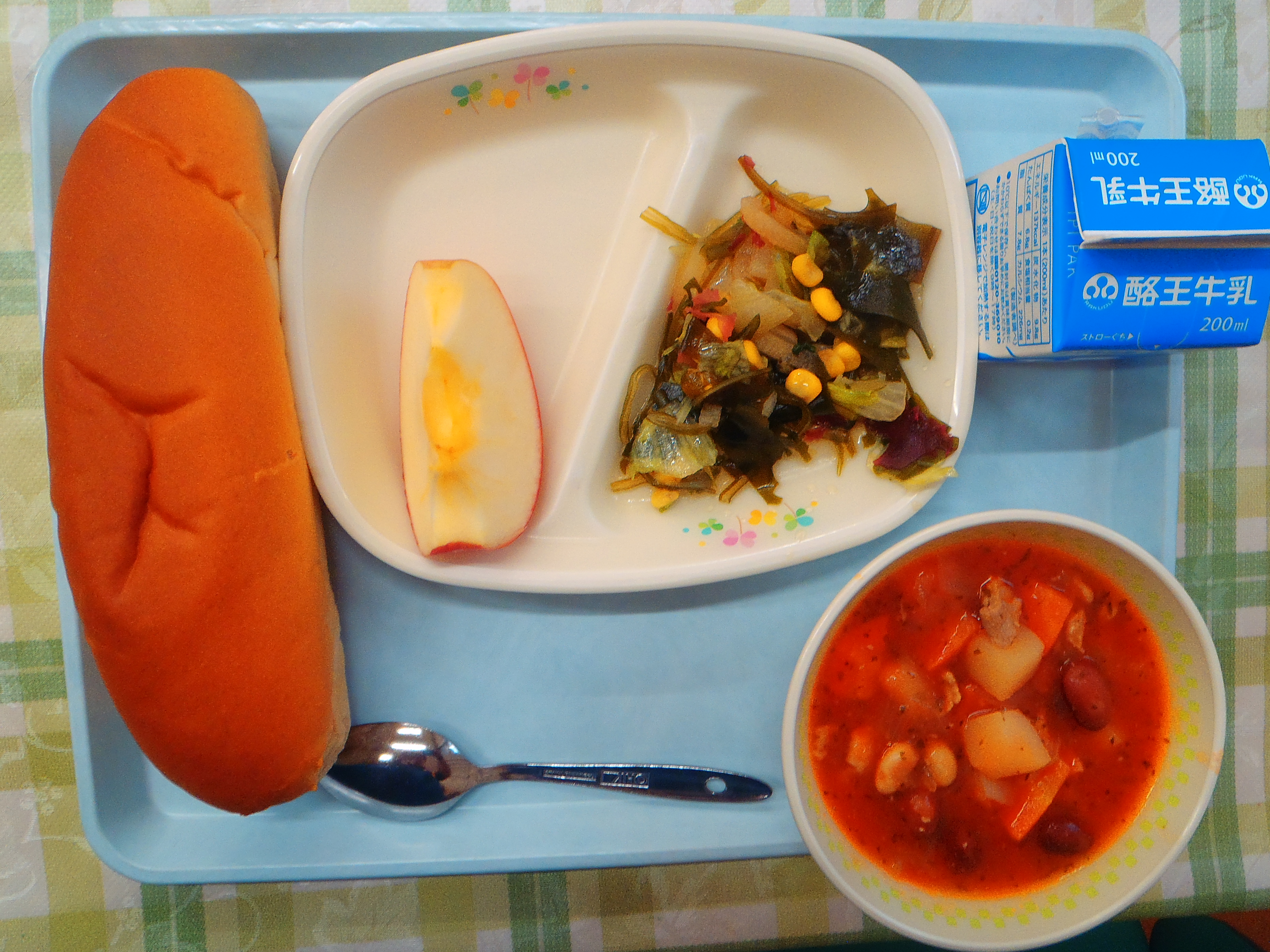 黒糖パン ポークビーンズ 海藻サラダ りんご 牛乳
