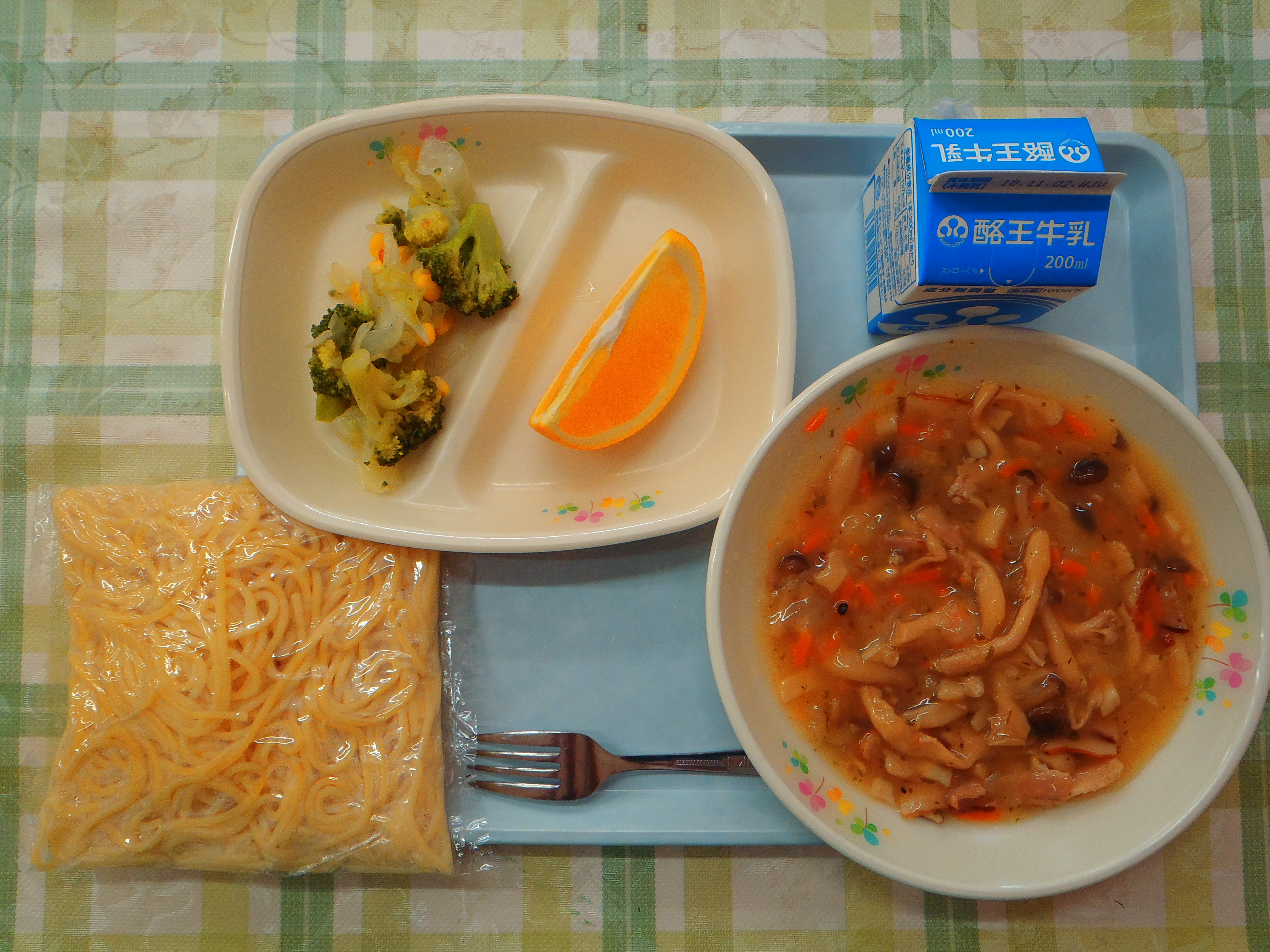 和風スパゲッティ ブロッコリーサラダ オレンジ 牛乳