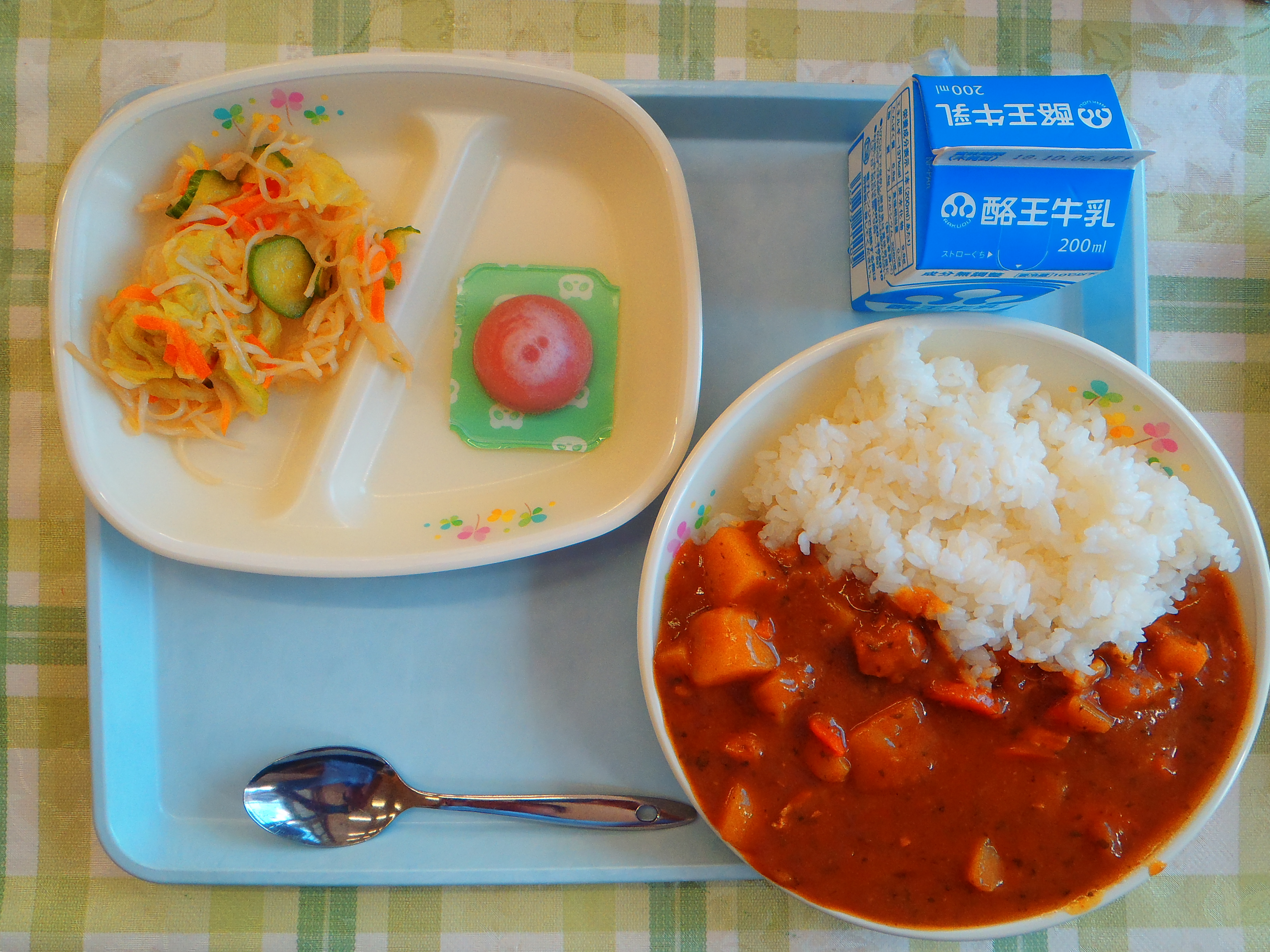 チキンカレーライス 糸かまサラダ 牛乳 ピュアいちごゼリー