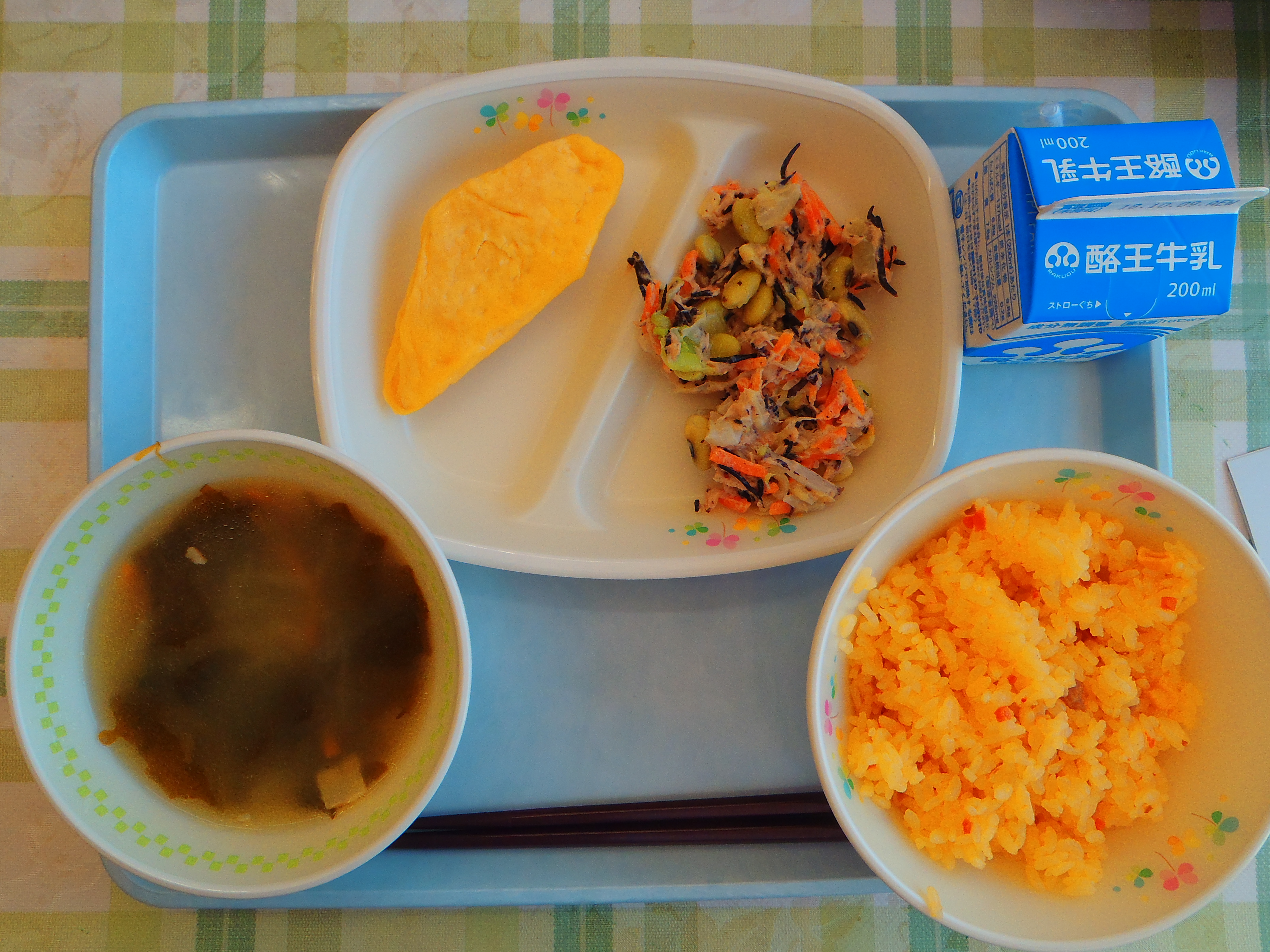 キャロットピラフ わかめスープ オムレツ ヒジキとツナのサラダ 牛乳