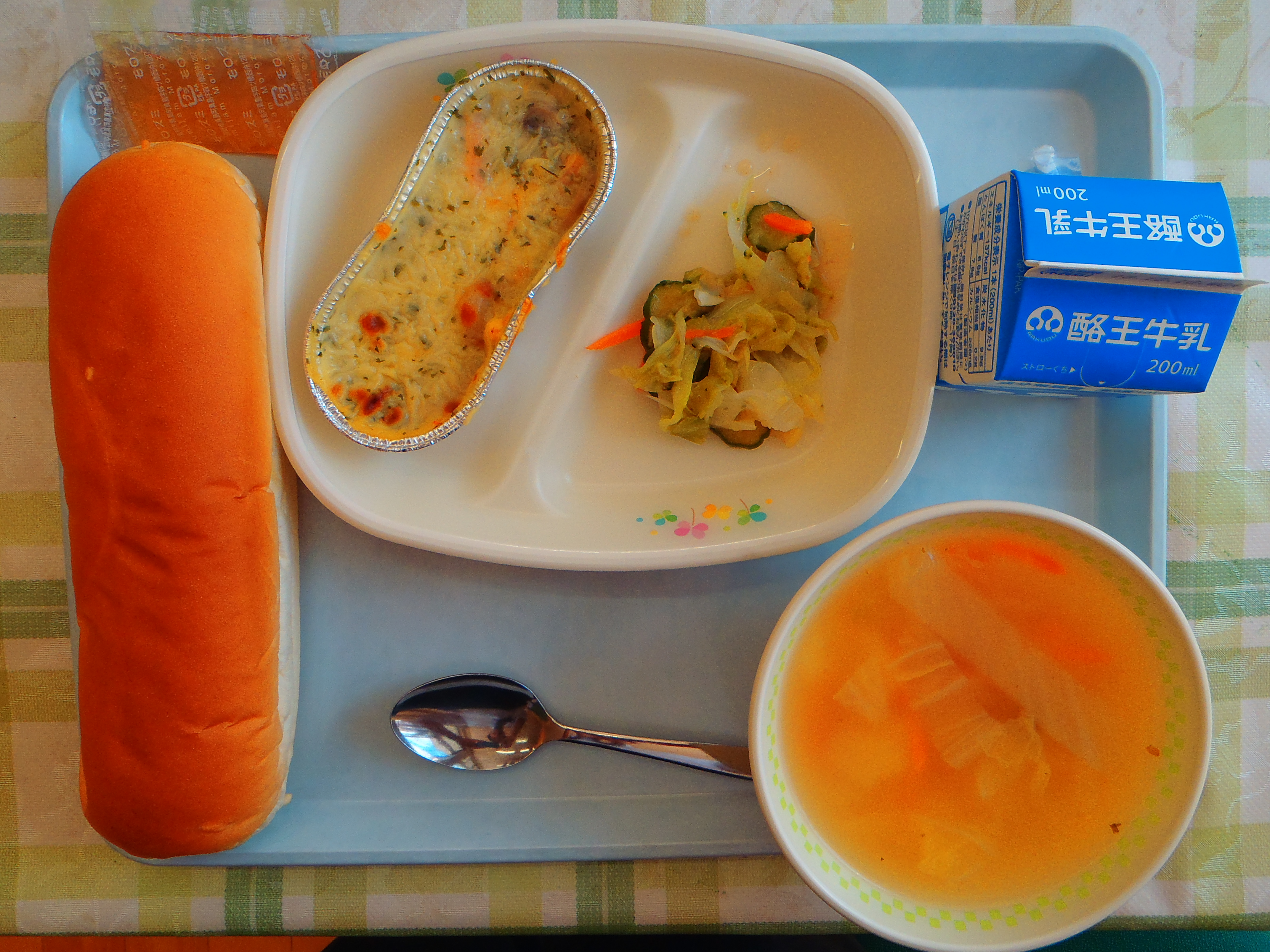 コッペパン 白菜スープ ブロッコリーサラダ シーフードグラタン 梨ジャム 牛乳