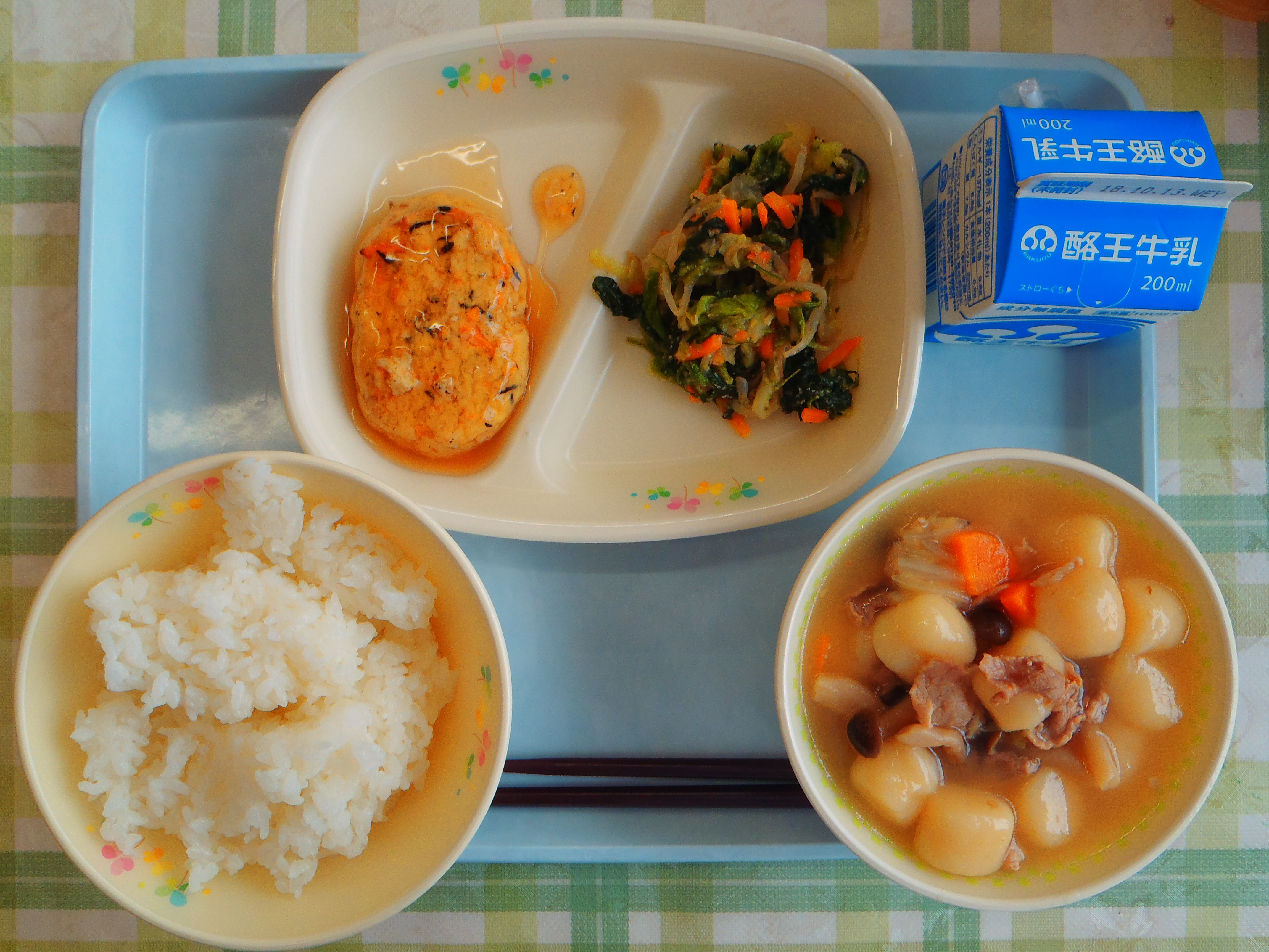 ごはん いも団子汁 ごまあえ 手作り豆腐ハンバーグ和風ソース 牛乳