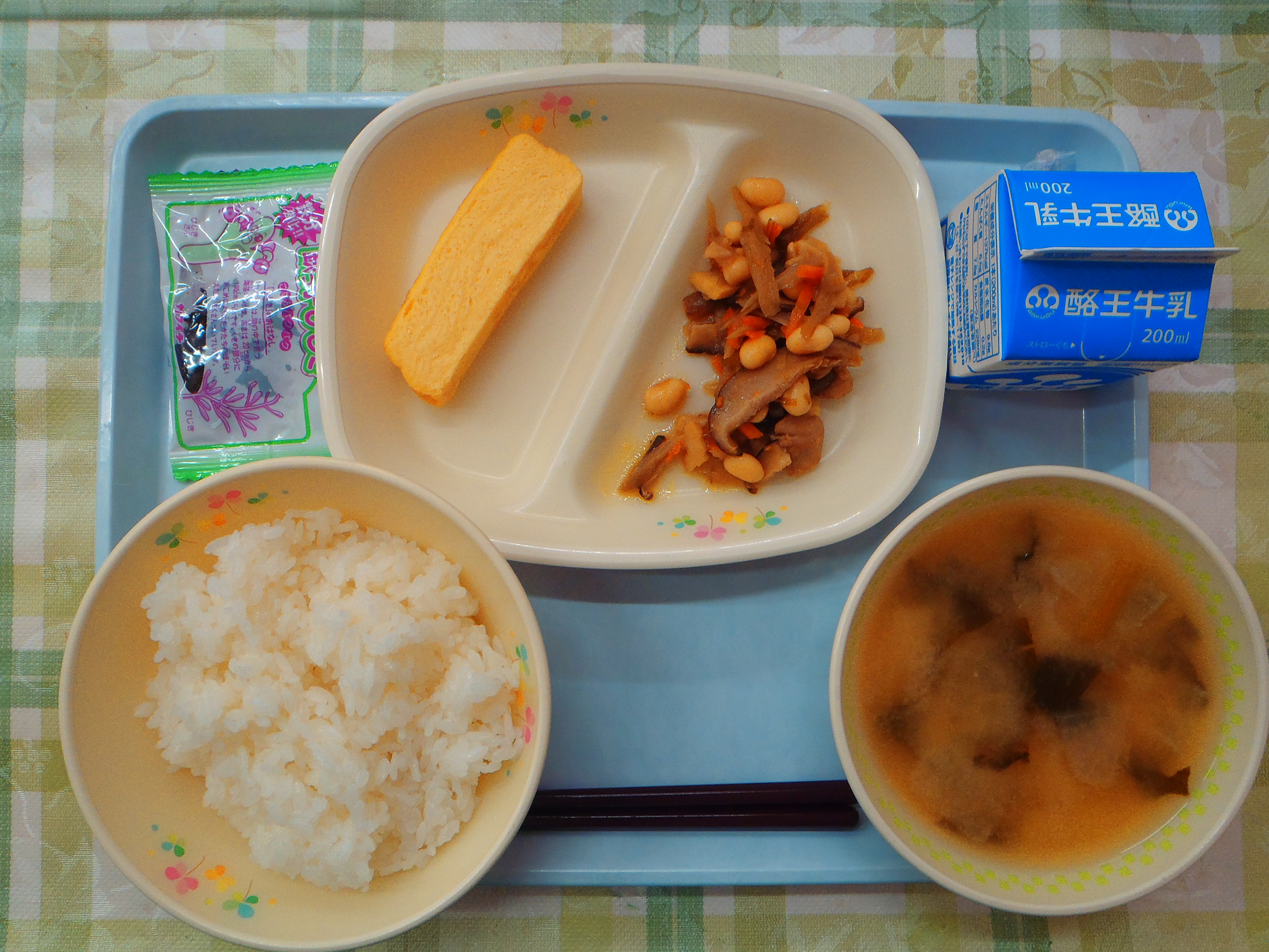 ごはん 青葉のみそ汁 大豆五目煮 厚焼き玉子 ひじき佃煮 牛乳