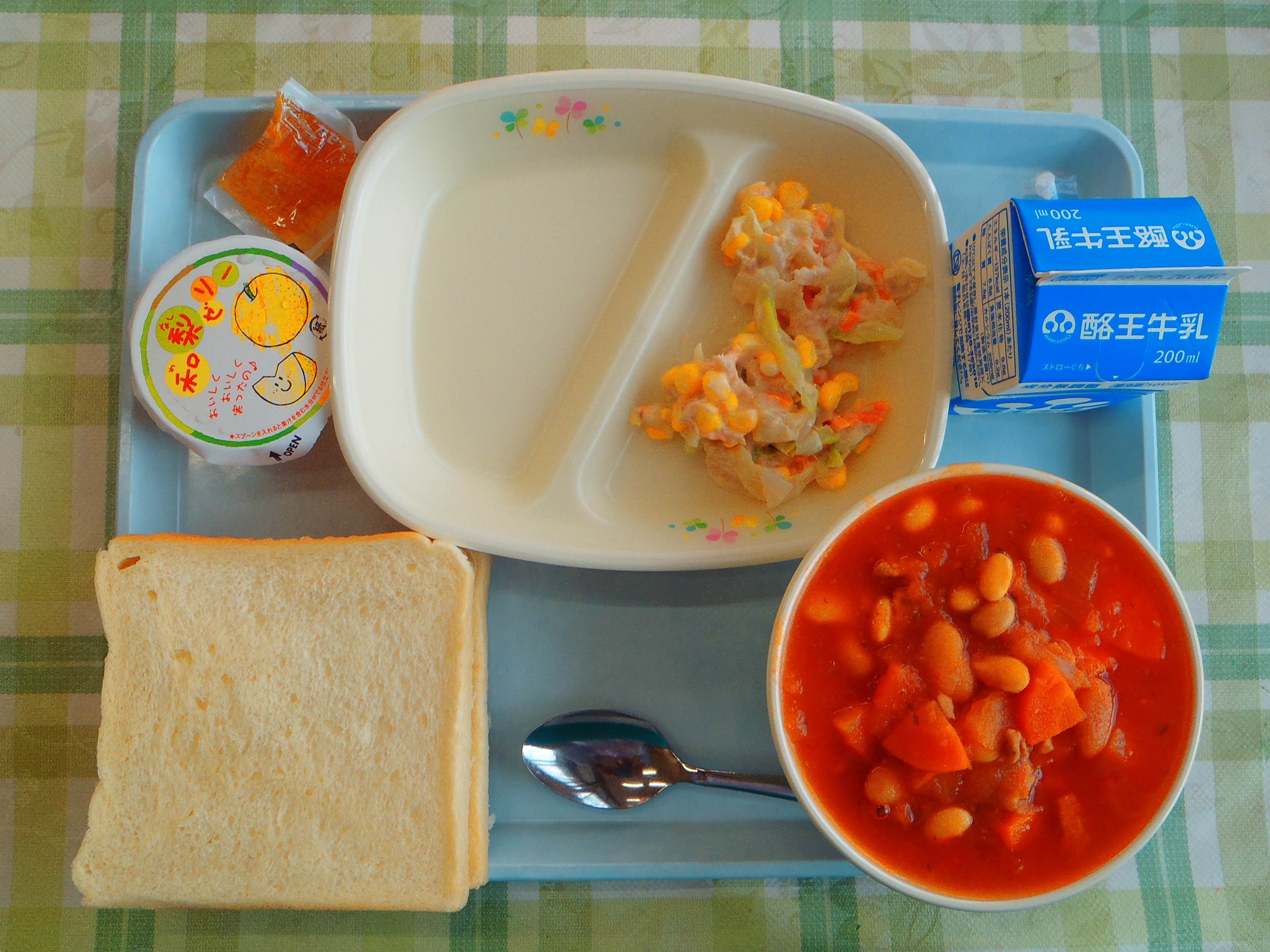 食パン ポークビーンズ ツナサラダ 梨ゼリー マーマレードジャム 牛乳