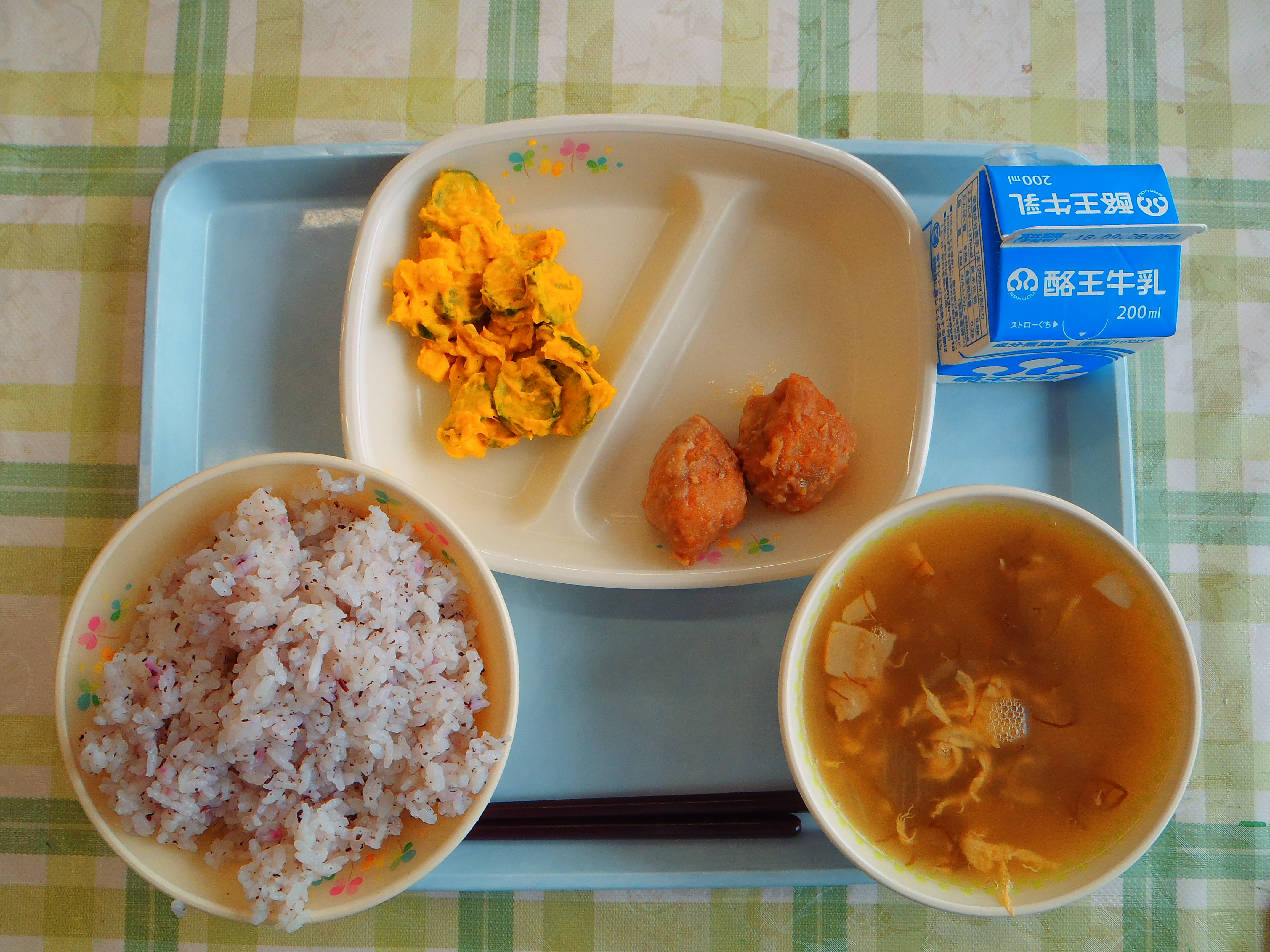 ゆかりごはん もずくスープ かぼちゃサラダ ごまみそ肉団子 牛乳