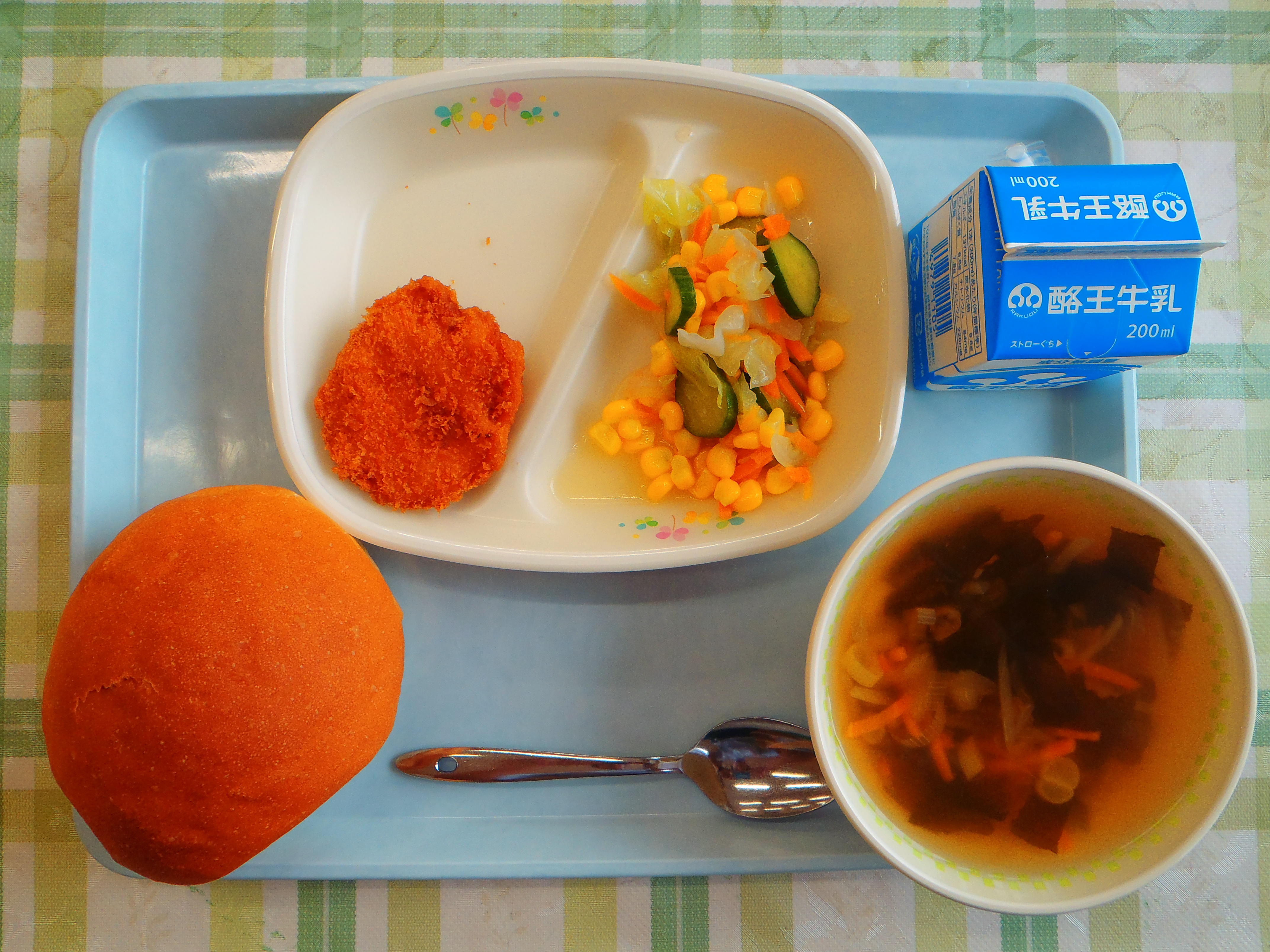 丸パン わかめスープ チキン味噌カツ コーンサラダ 牛乳