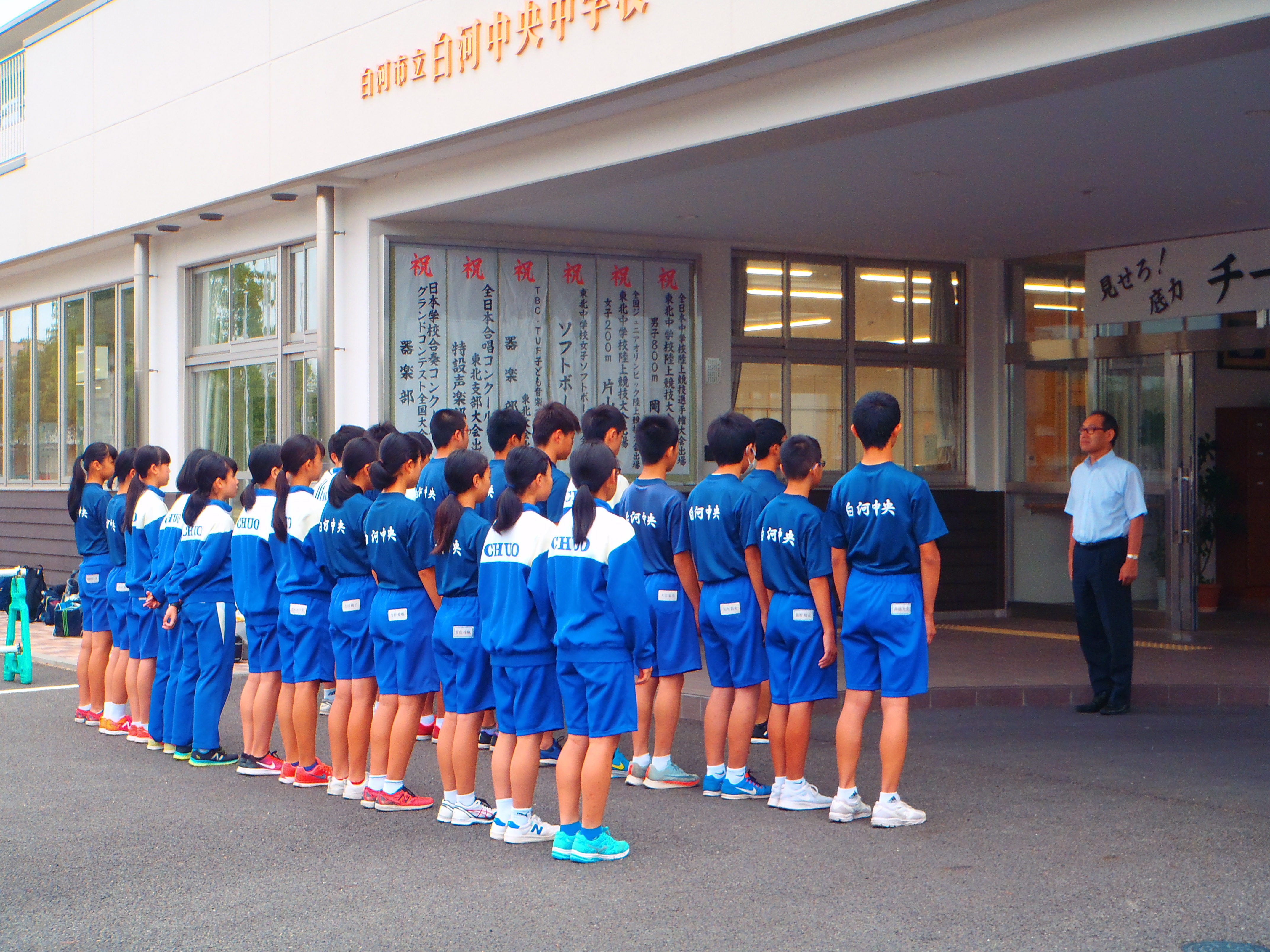 県中体連陸上大会へ向け、チーム中央、陸上部員が出発しました。
