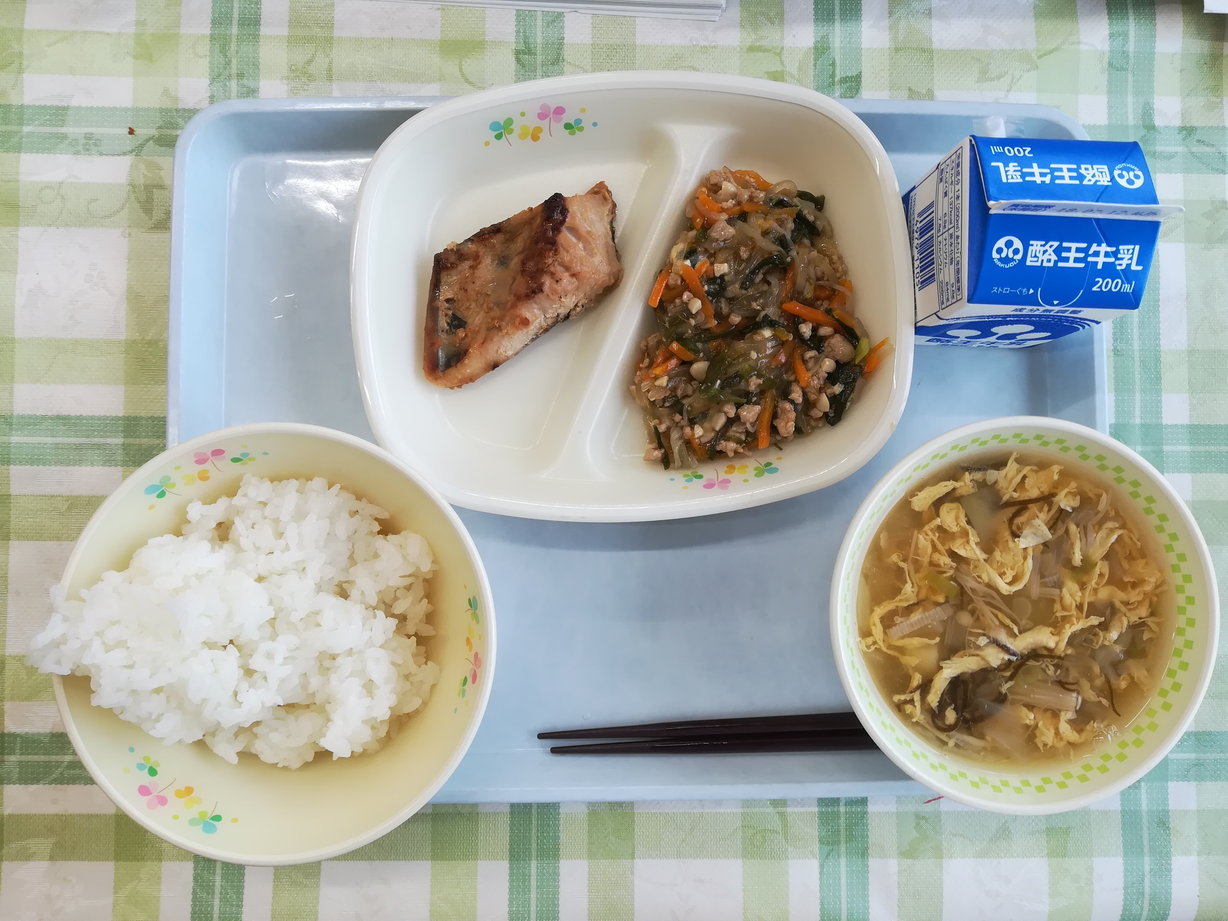 ごはん もずく入りかきたま汁 もやしのひき肉炒め さばの香味焼き 牛乳