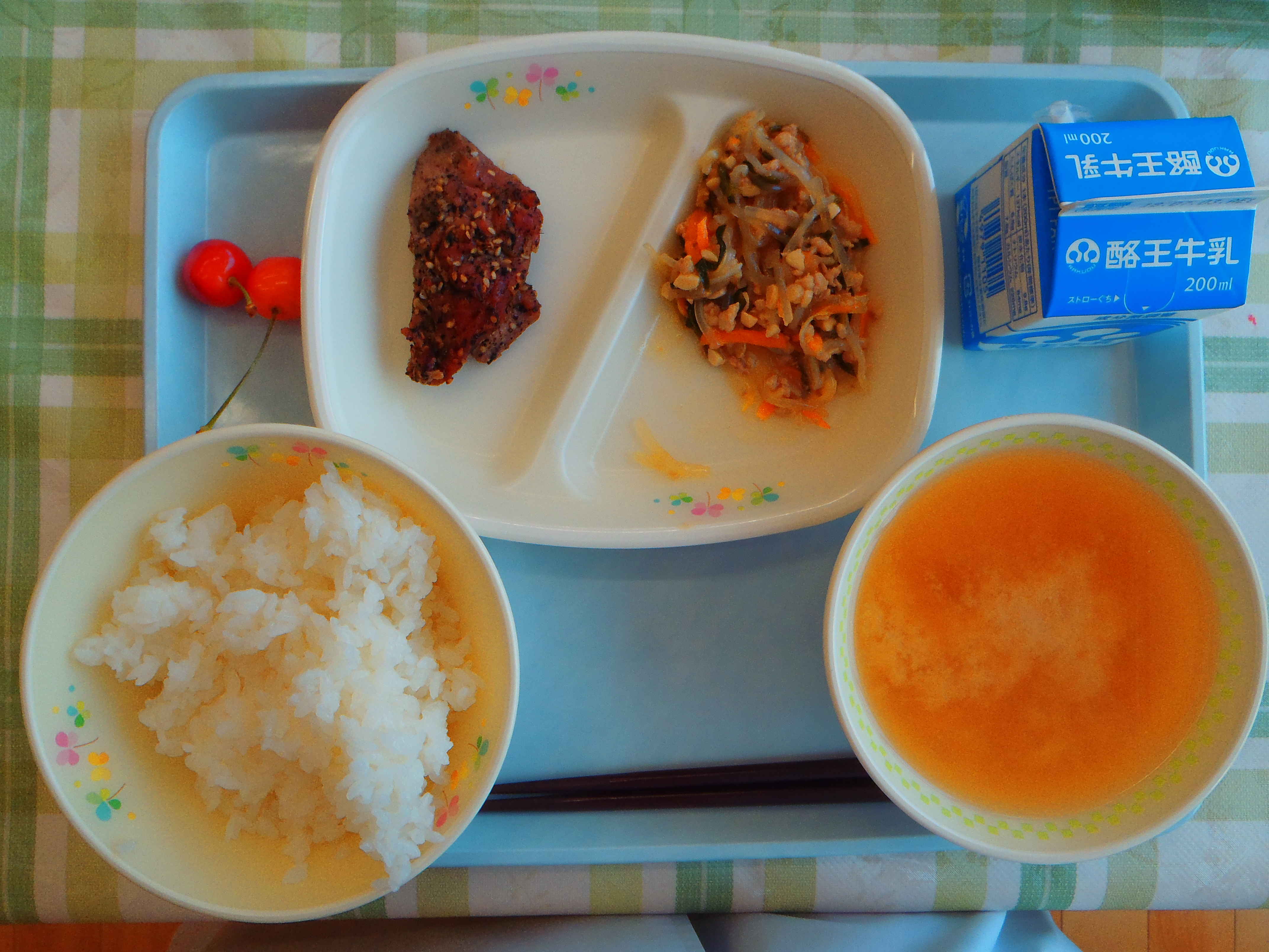 ごはん 玉ねぎのみそ汁 もやしのひき肉炒め 地鶏の南部焼き さくらんぼ 牛乳