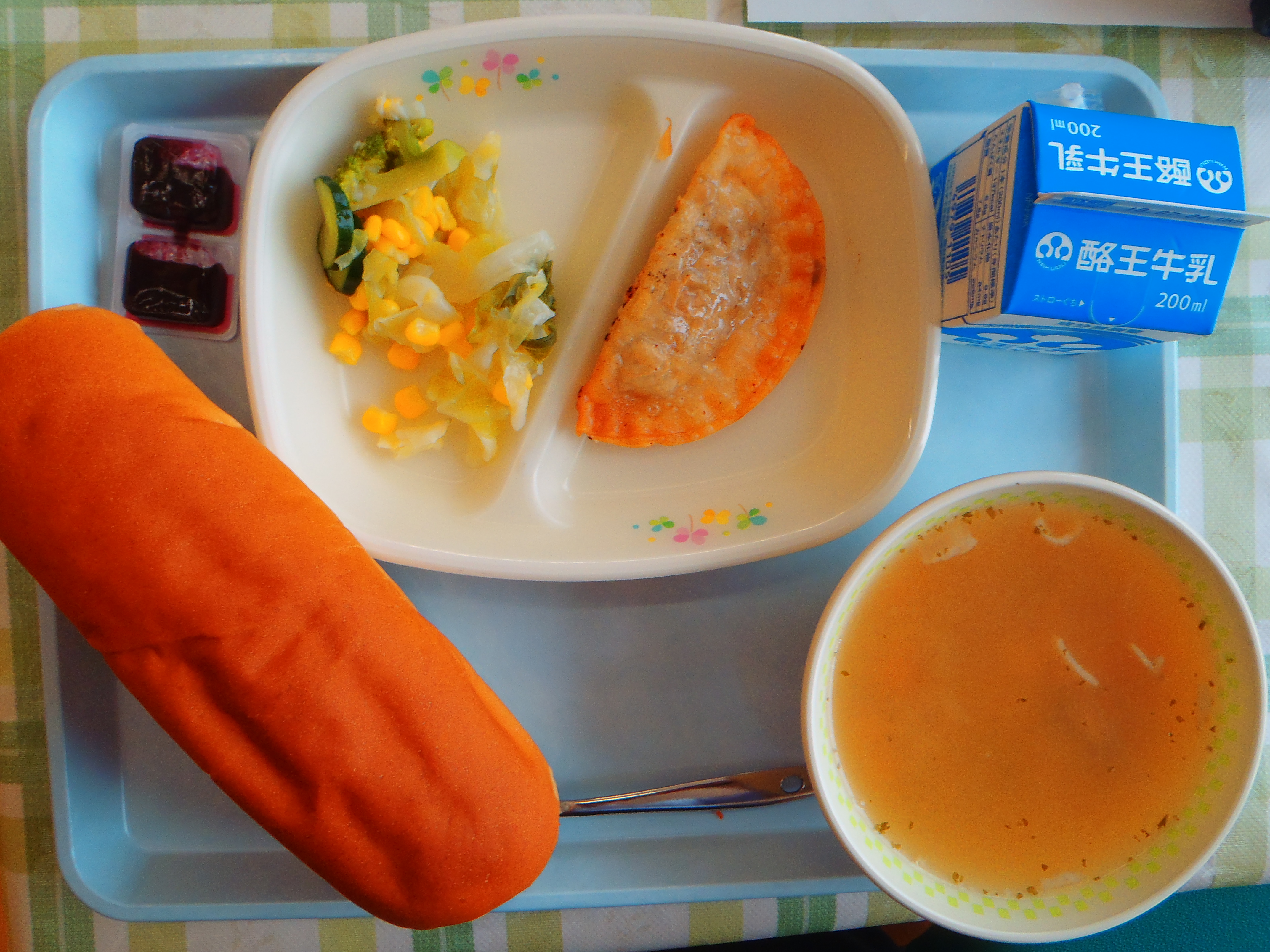 コッペパン 大豆スープ パリツォーネ コーンサラダ ブルーベリージャム 牛乳