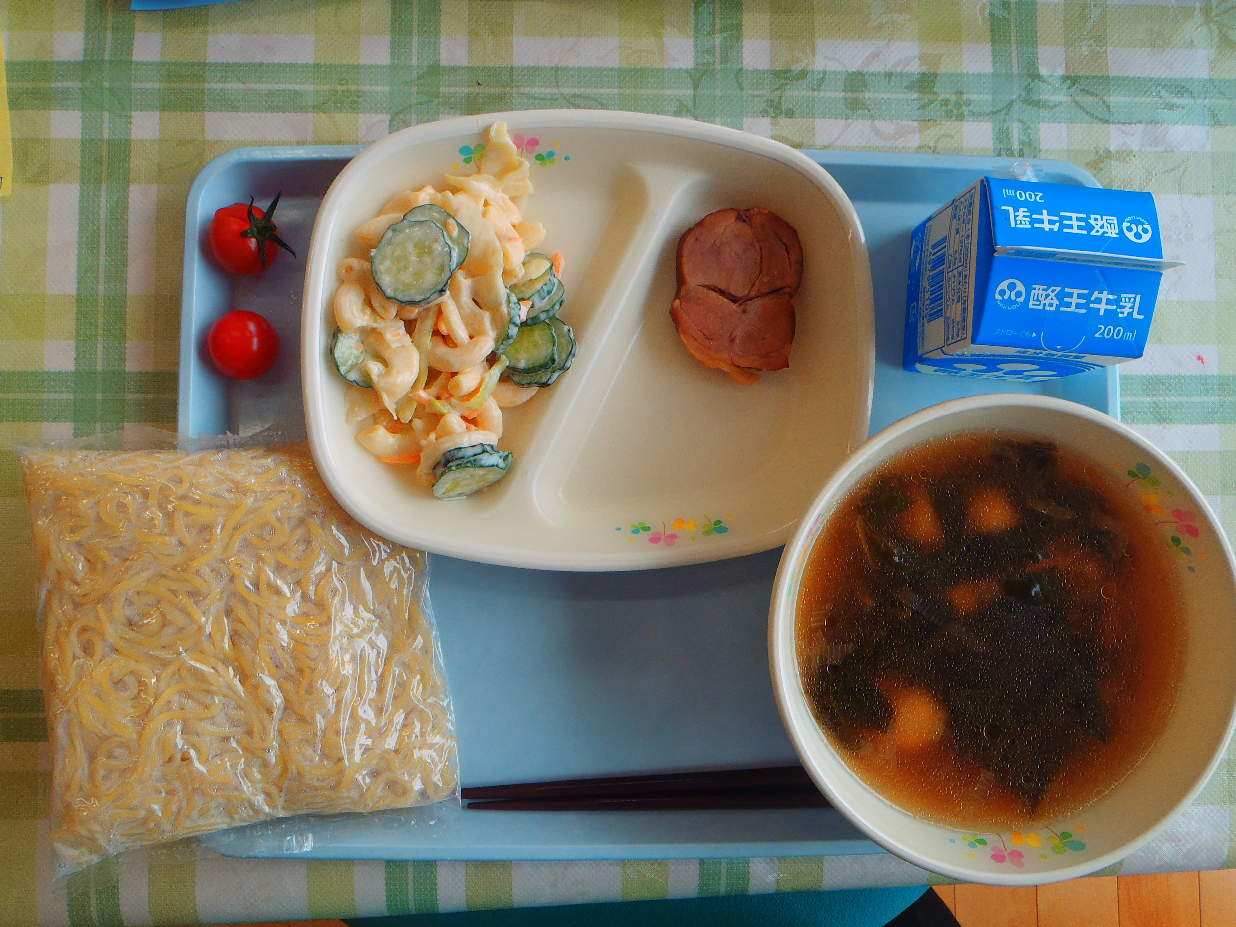 白河ラーメン マカロニサラダ ミニトマト 牛乳
