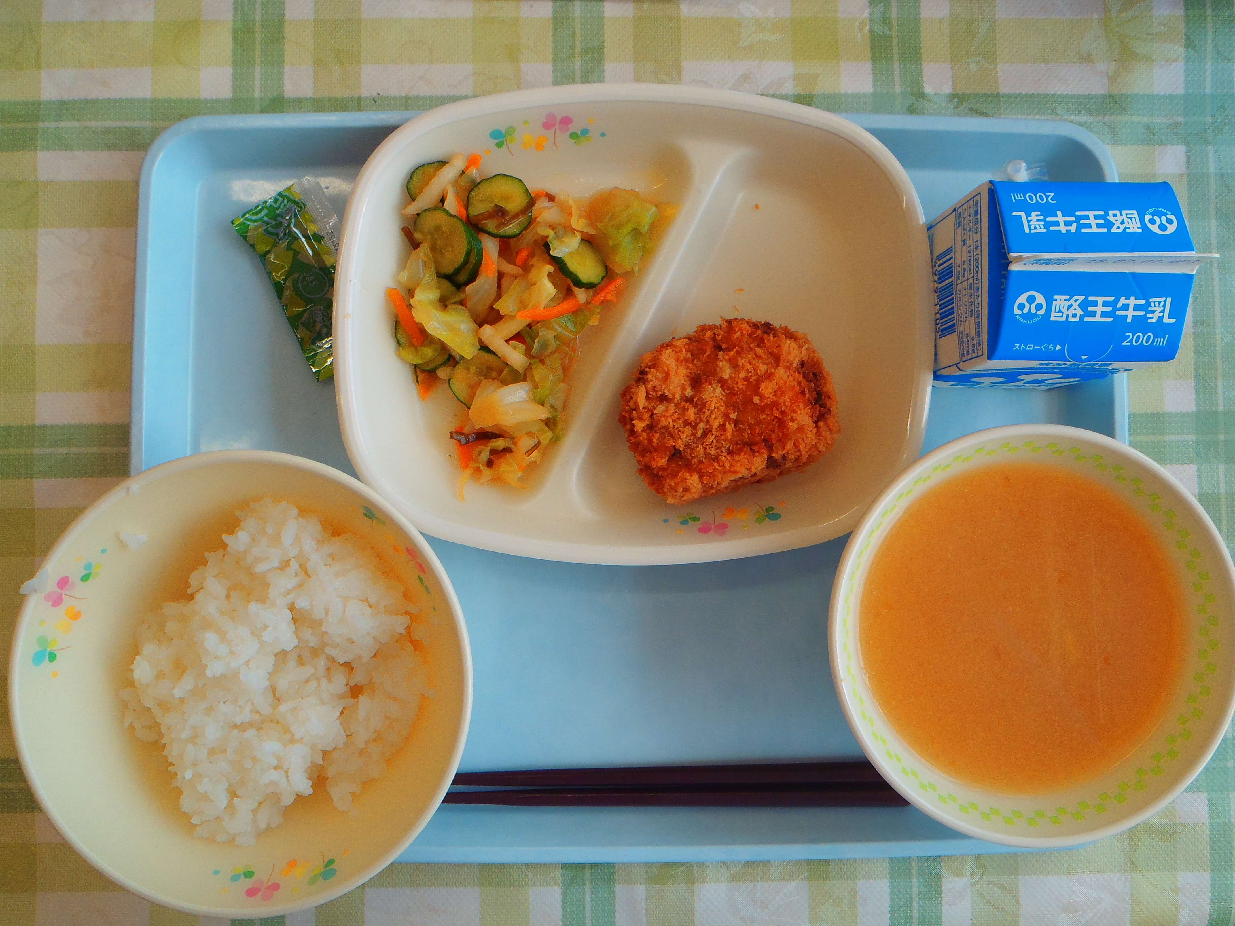 ごはん なめこのみそ汁 塩こんぶあえ 手作りコロッケ ソース 牛乳