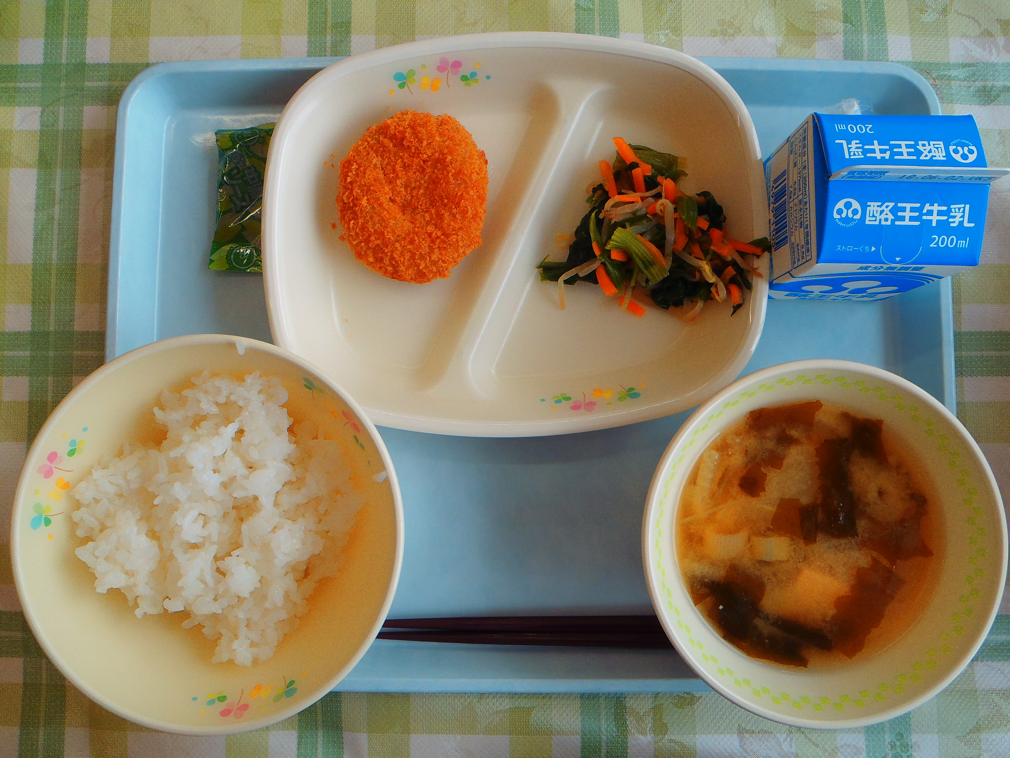 ごはん 厚揚げのみそ汁 おひたし メンチカツ パックソース 牛乳