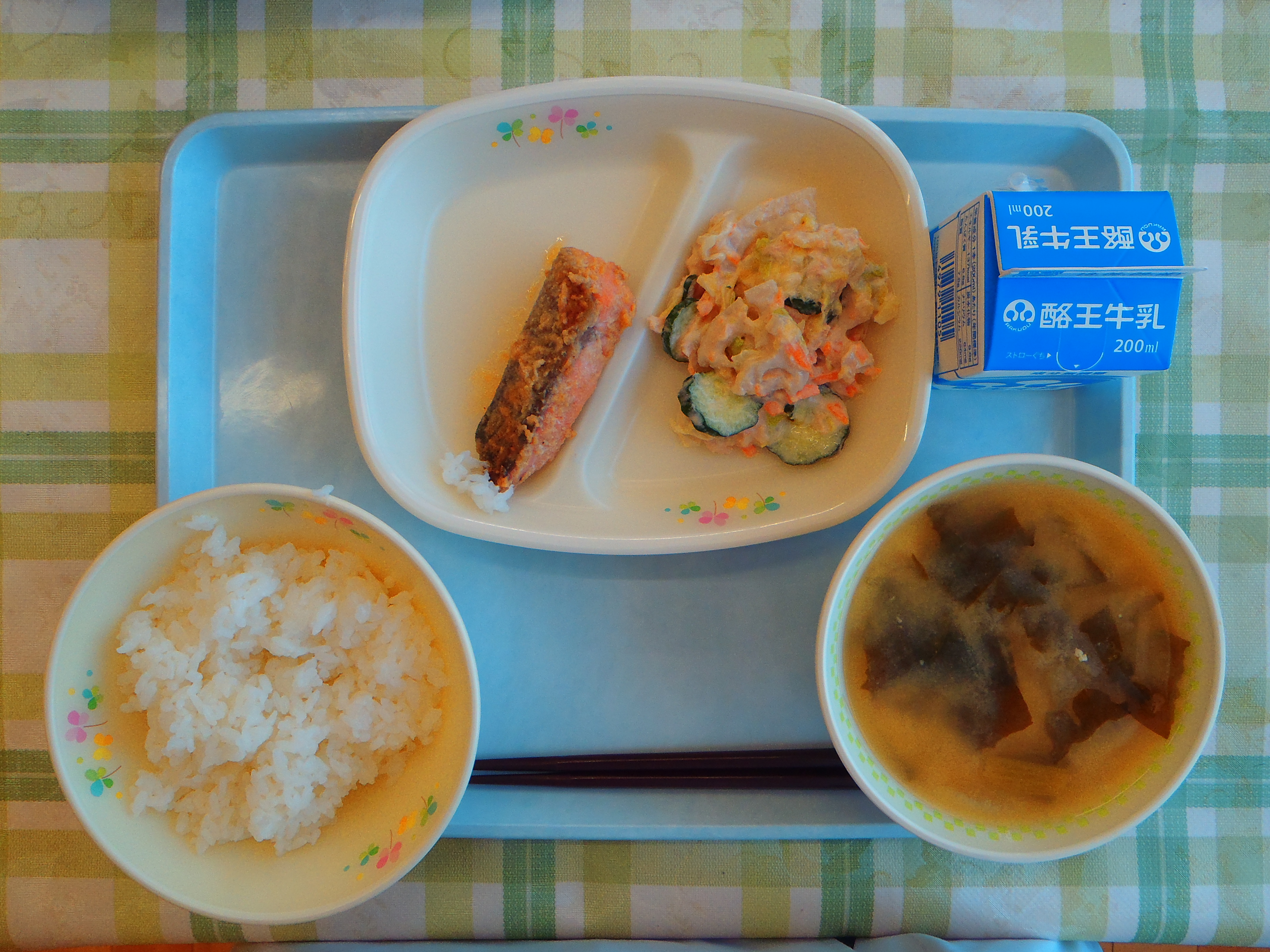 ごはん じゃがいものみそ汁 レンコンサラダ サケのごま焼き 牛乳