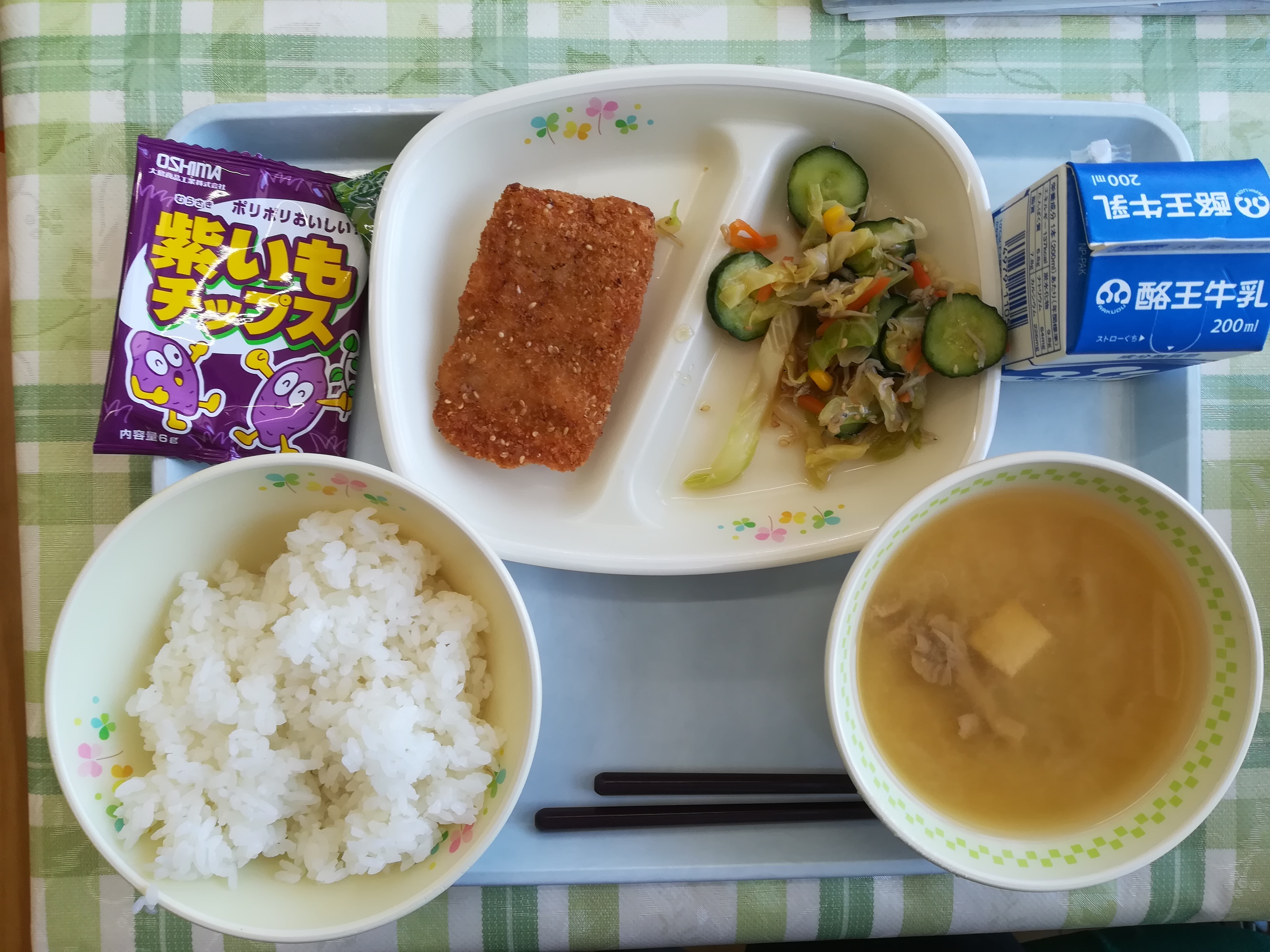 ごはん 大根のみそ汁 ジャコサラダ イカカツごまフライ ソース 紫いもチップス 牛乳
