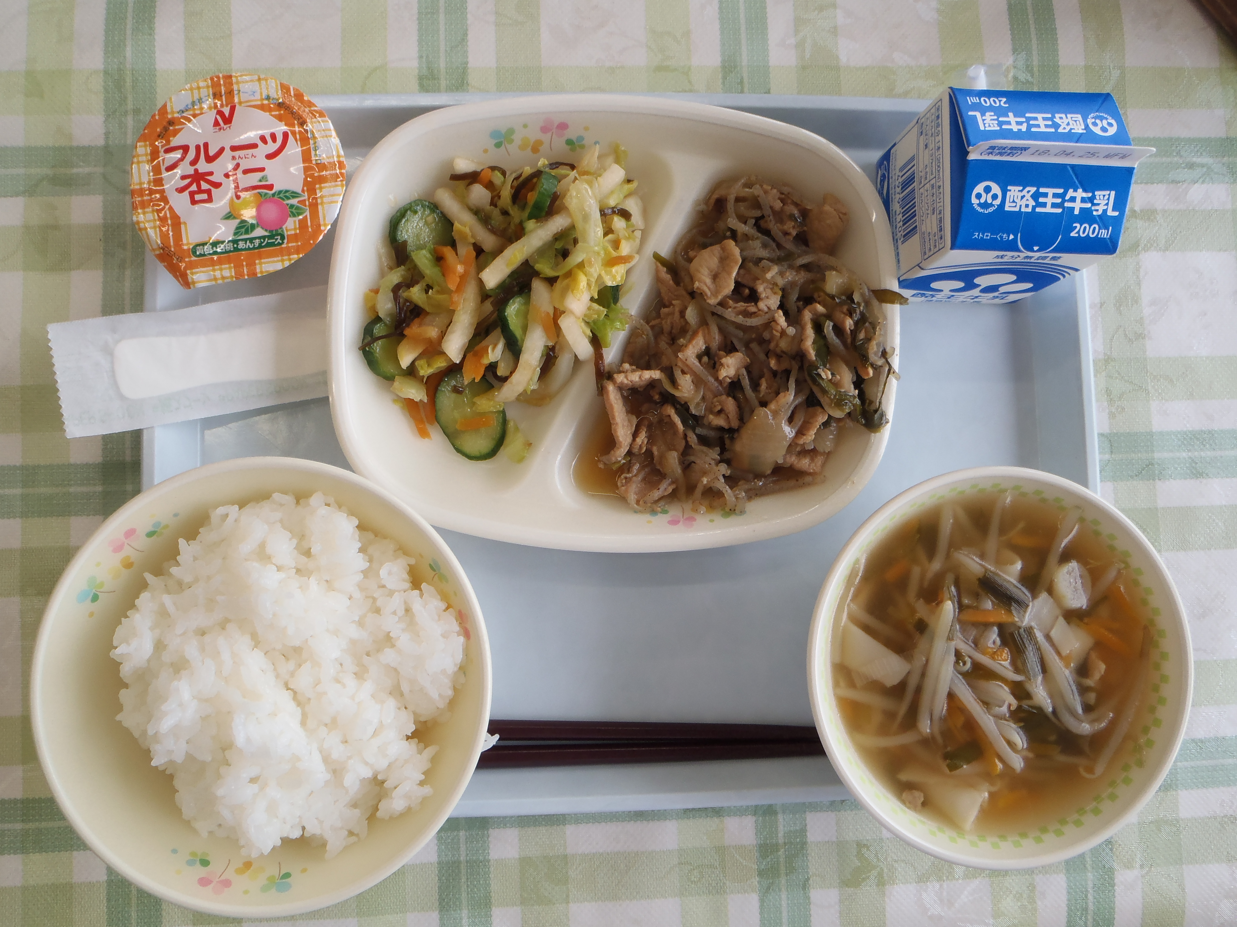 焼き肉丼 ワンタンスープ 塩こんぶあえ フルーツ杏仁 牛乳