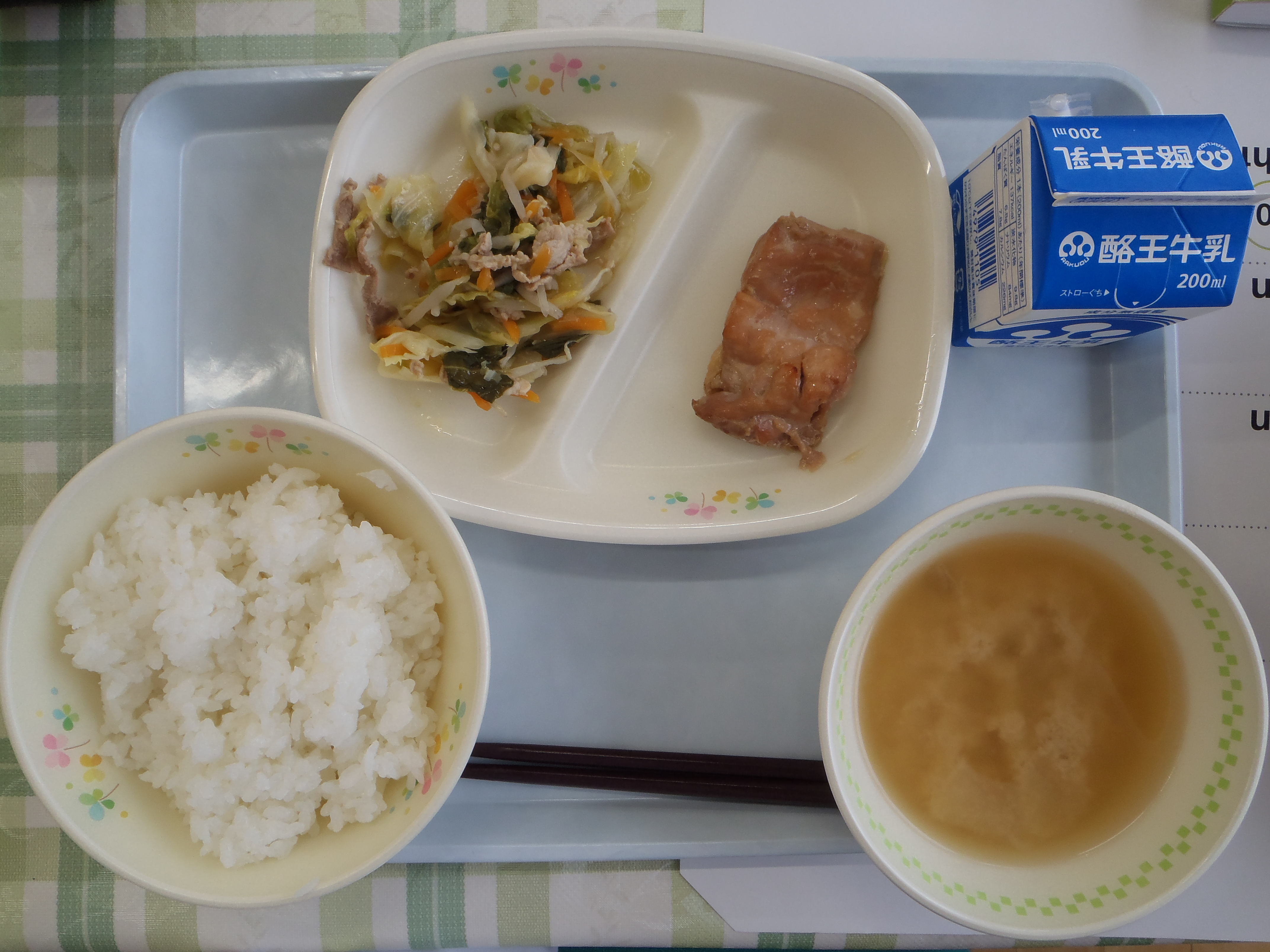 ごはん 大根のみそ汁 野菜炒め 鶏肉の照り焼き 牛乳