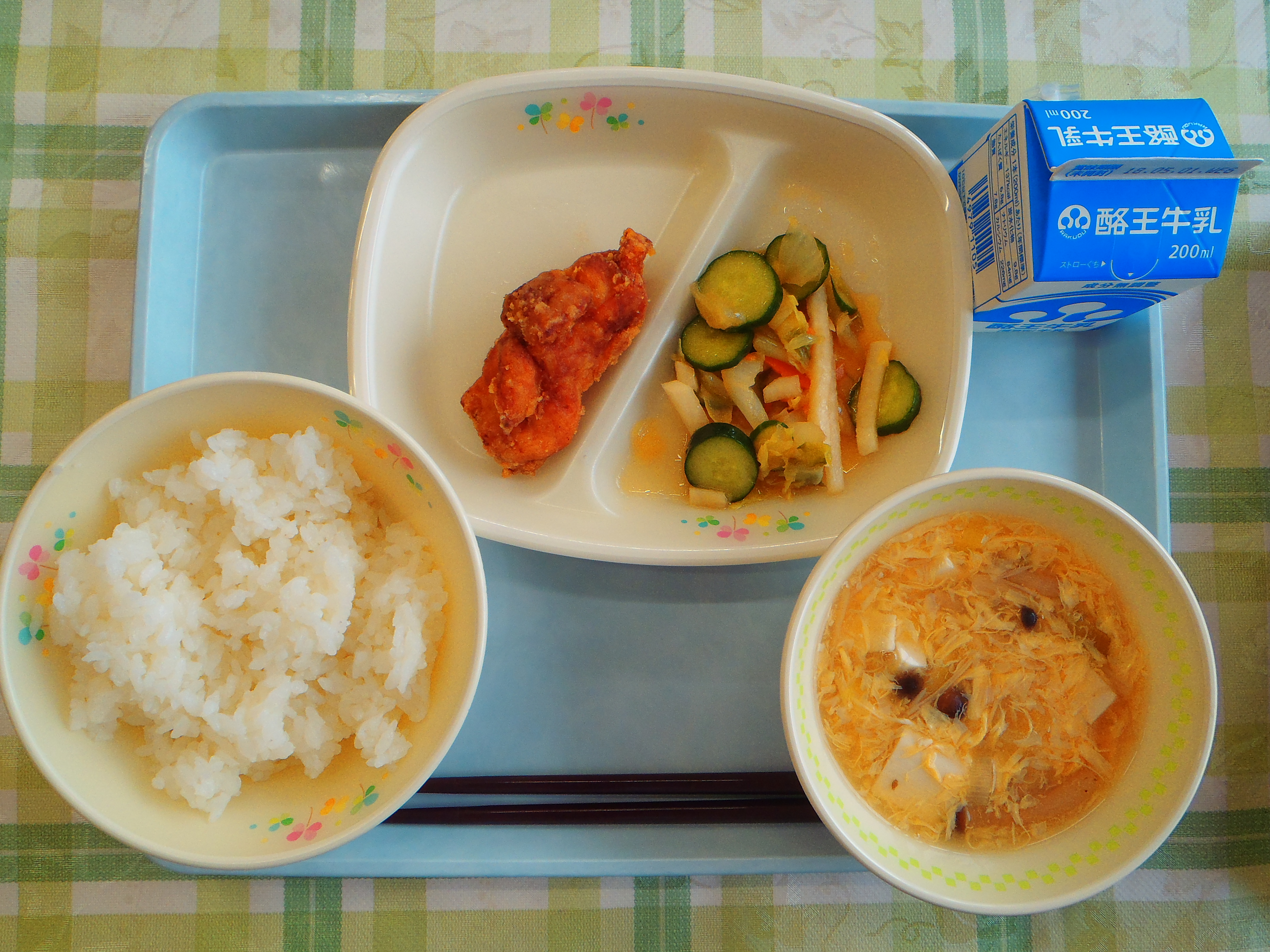 ごはん かきたま汁 和風サラダ 鶏のから揚げ 牛乳