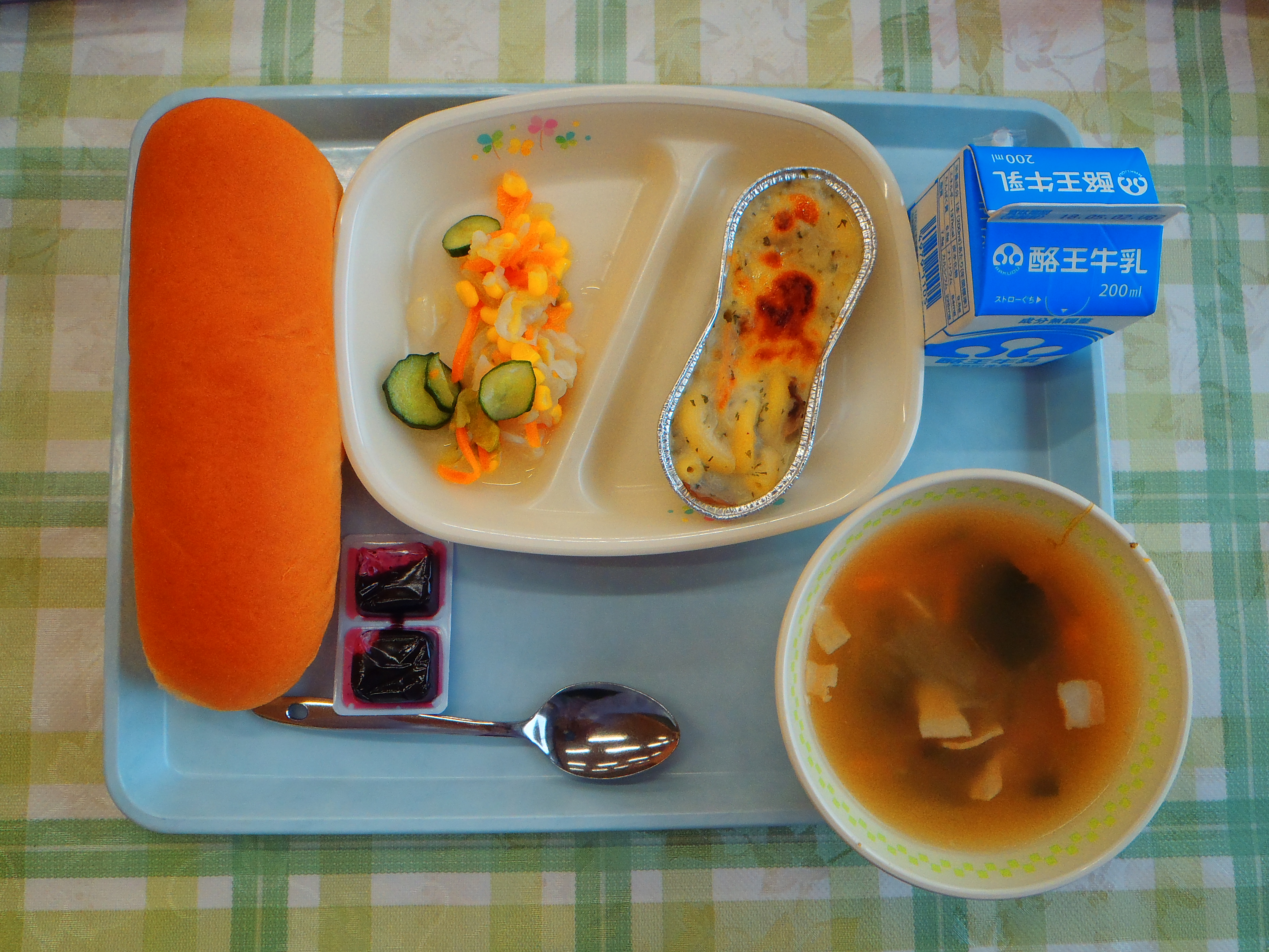 コッペパン 野菜スープ コールスローサラダ マカロニグラタン ブルーベリージャム 牛乳