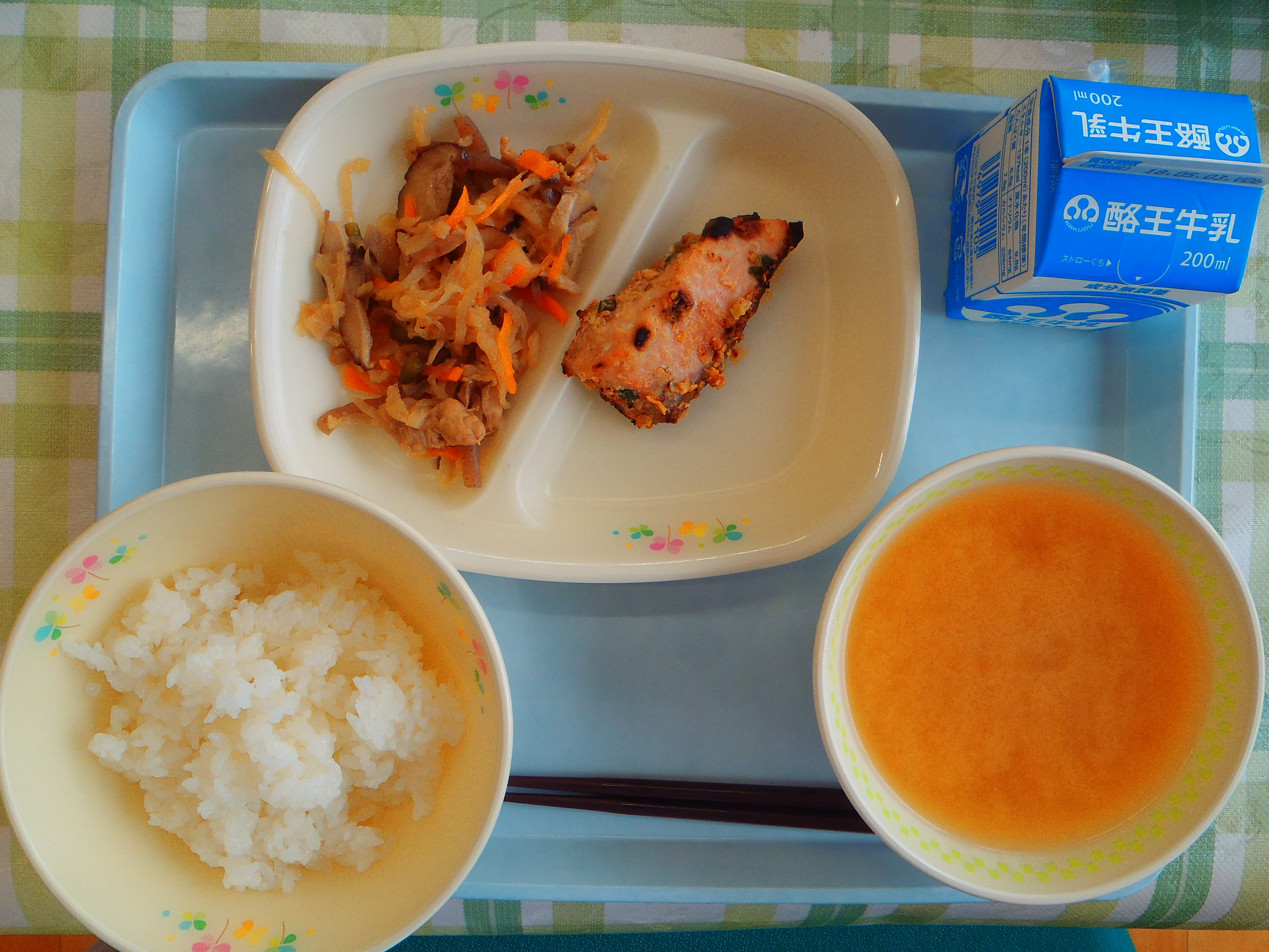 ごはん 玉ねぎのみそ汁 切り干し大根の炒め煮 サケの三味焼き 牛乳