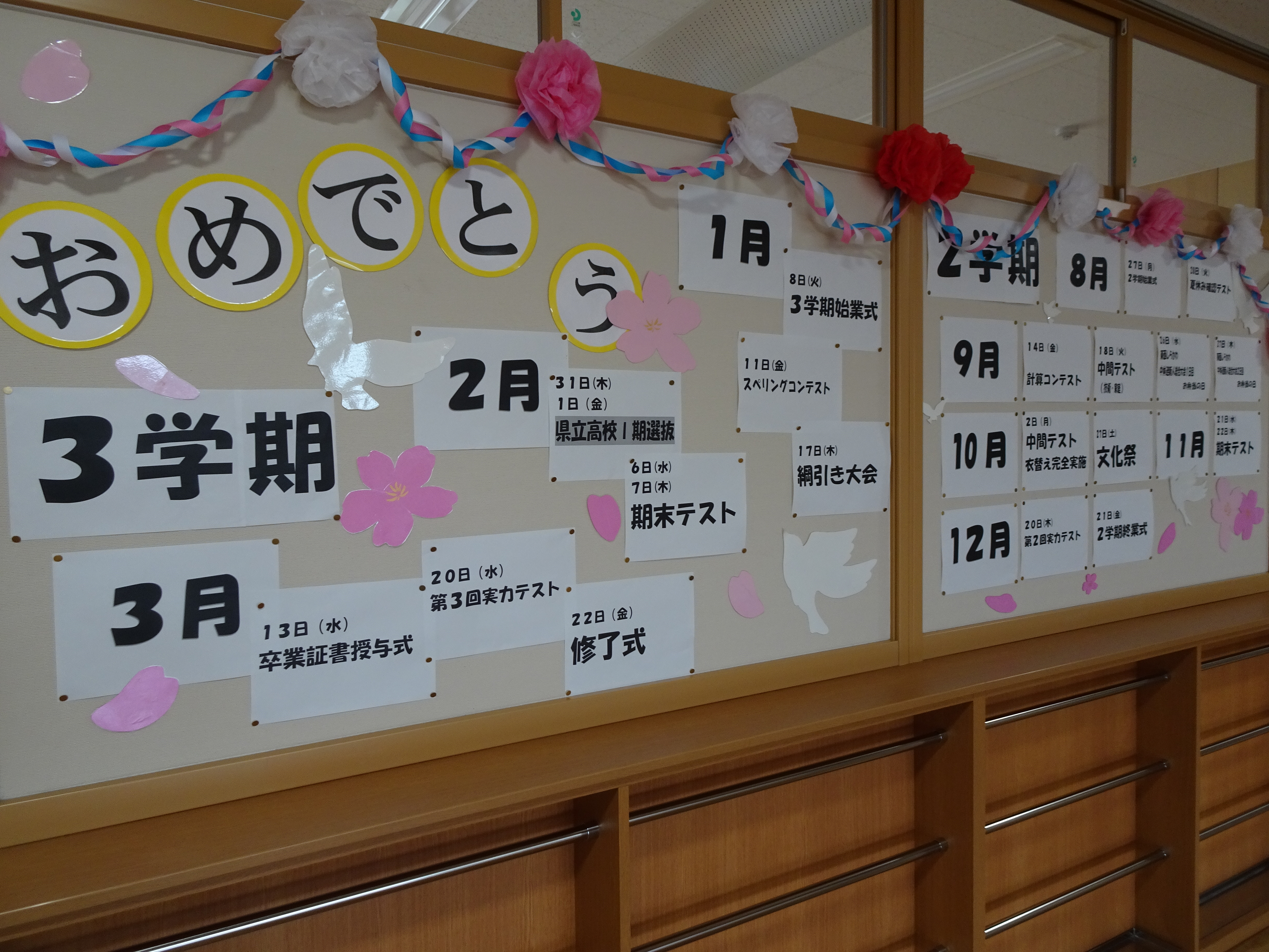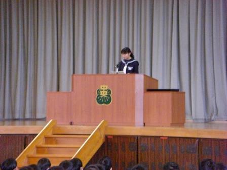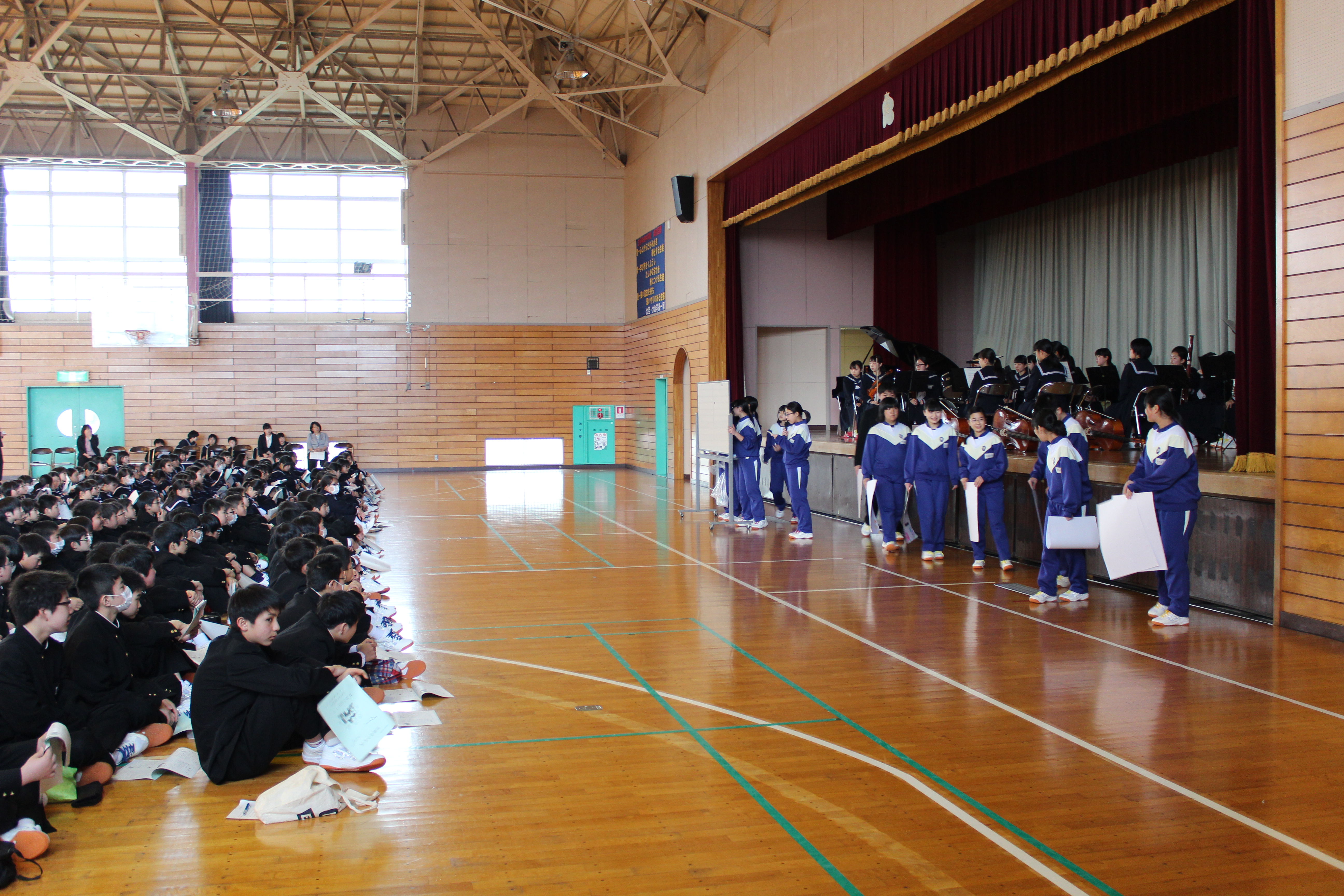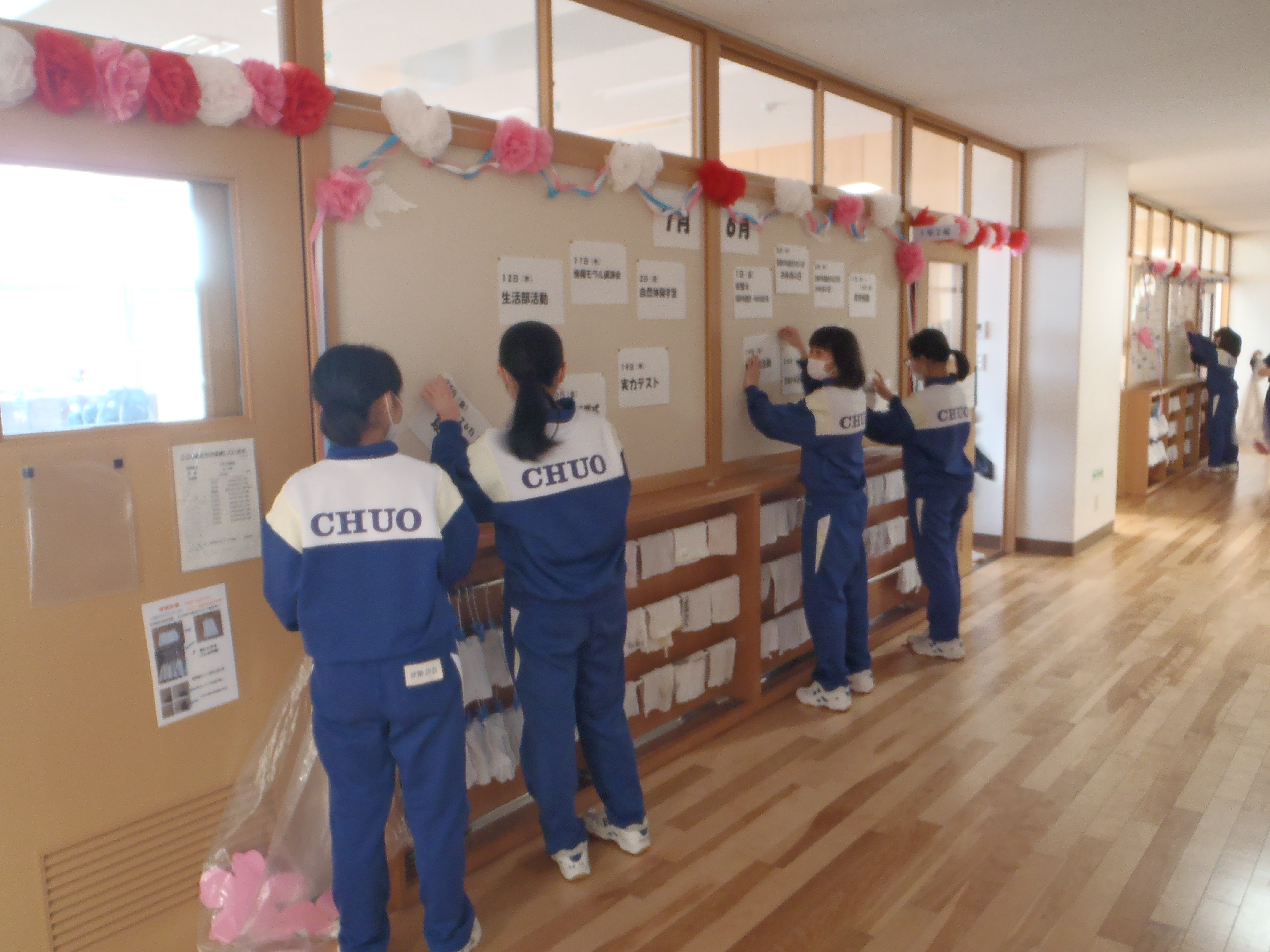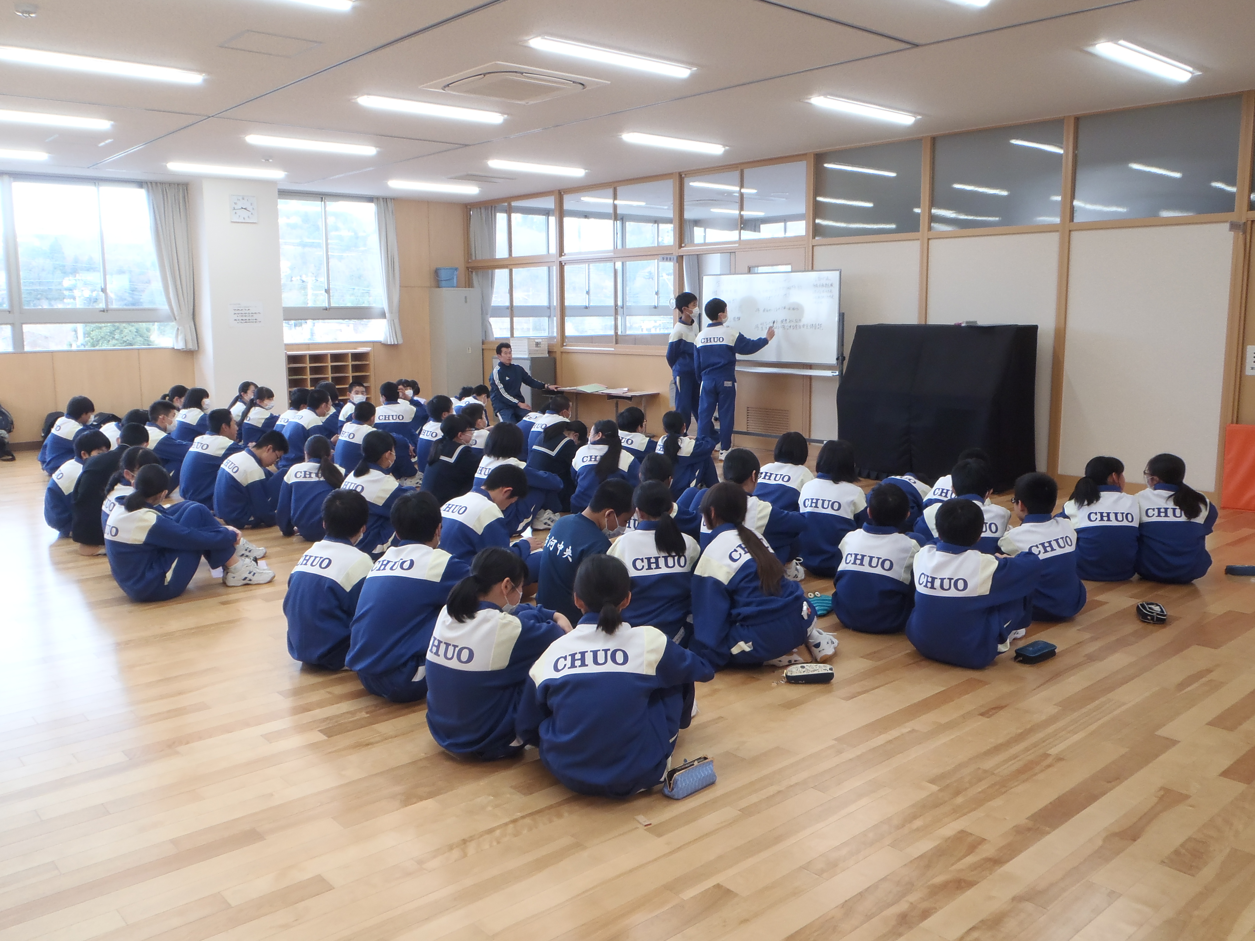 1年生は、先輩となるため先輩らしいしっかりとした生活をすること。2年生は、中央中の顔だという自覚を持って生活をすること。そして、全体として、春休みには文武両道で規則正しい生活をしていきましょう。来年度も素晴らしい中央中を創り上げていきましょう。というお話がありました。