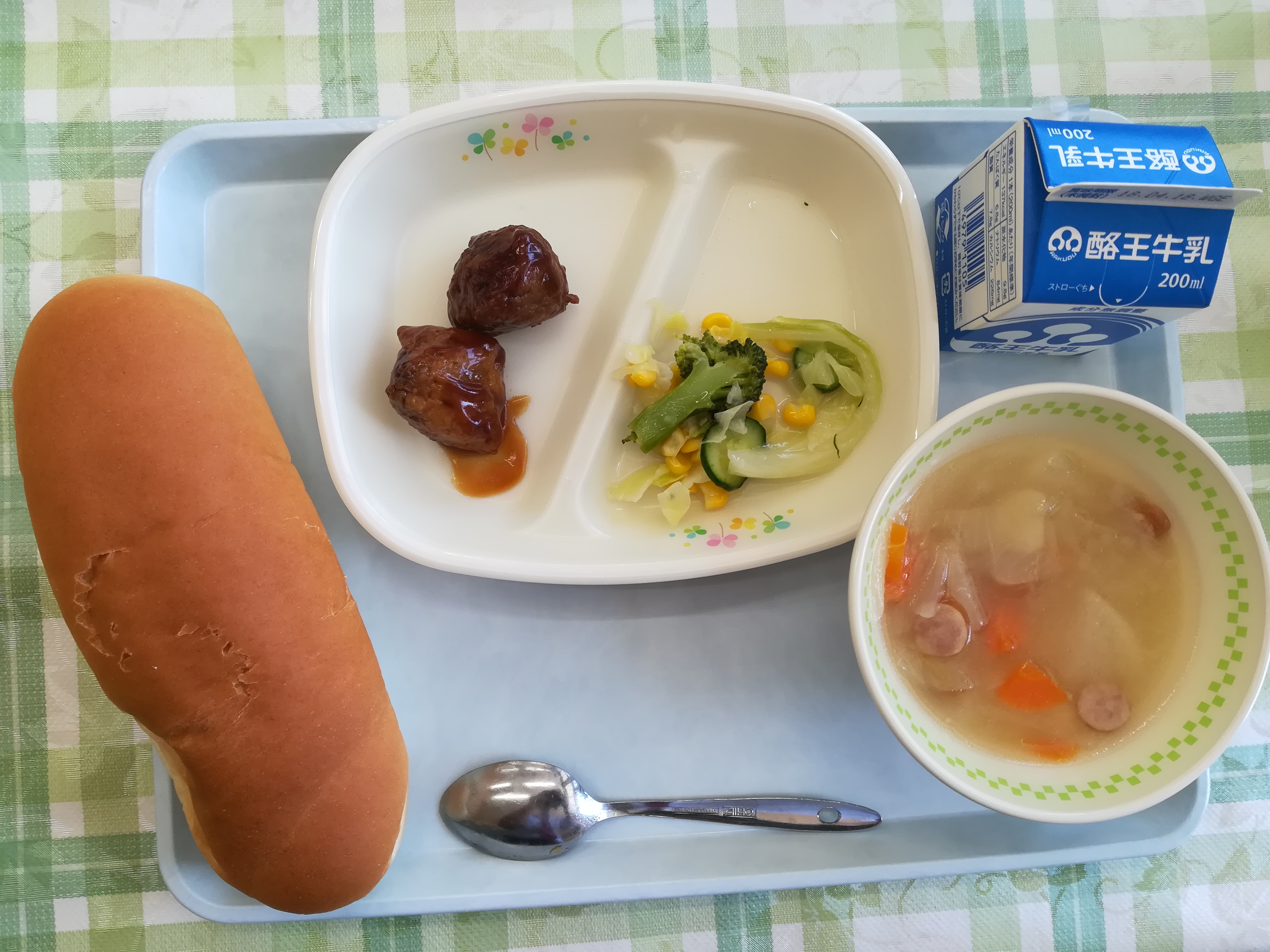 コッペパン いちごジャム ポトフ コーンサラダ 五目野菜肉団子 牛乳