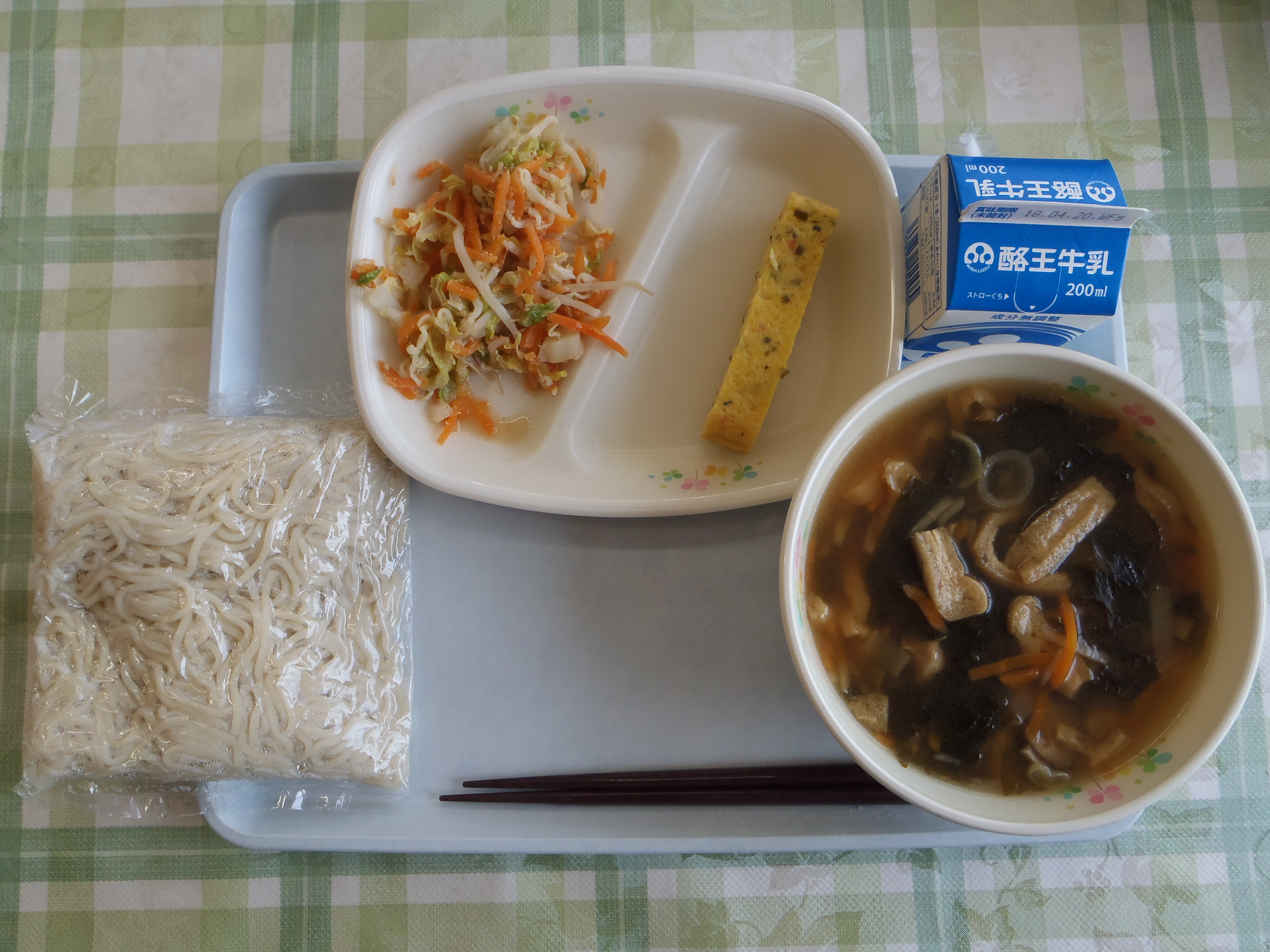 わかめうどん 具だくさん玉子焼き ゴマ酢あえ 牛乳