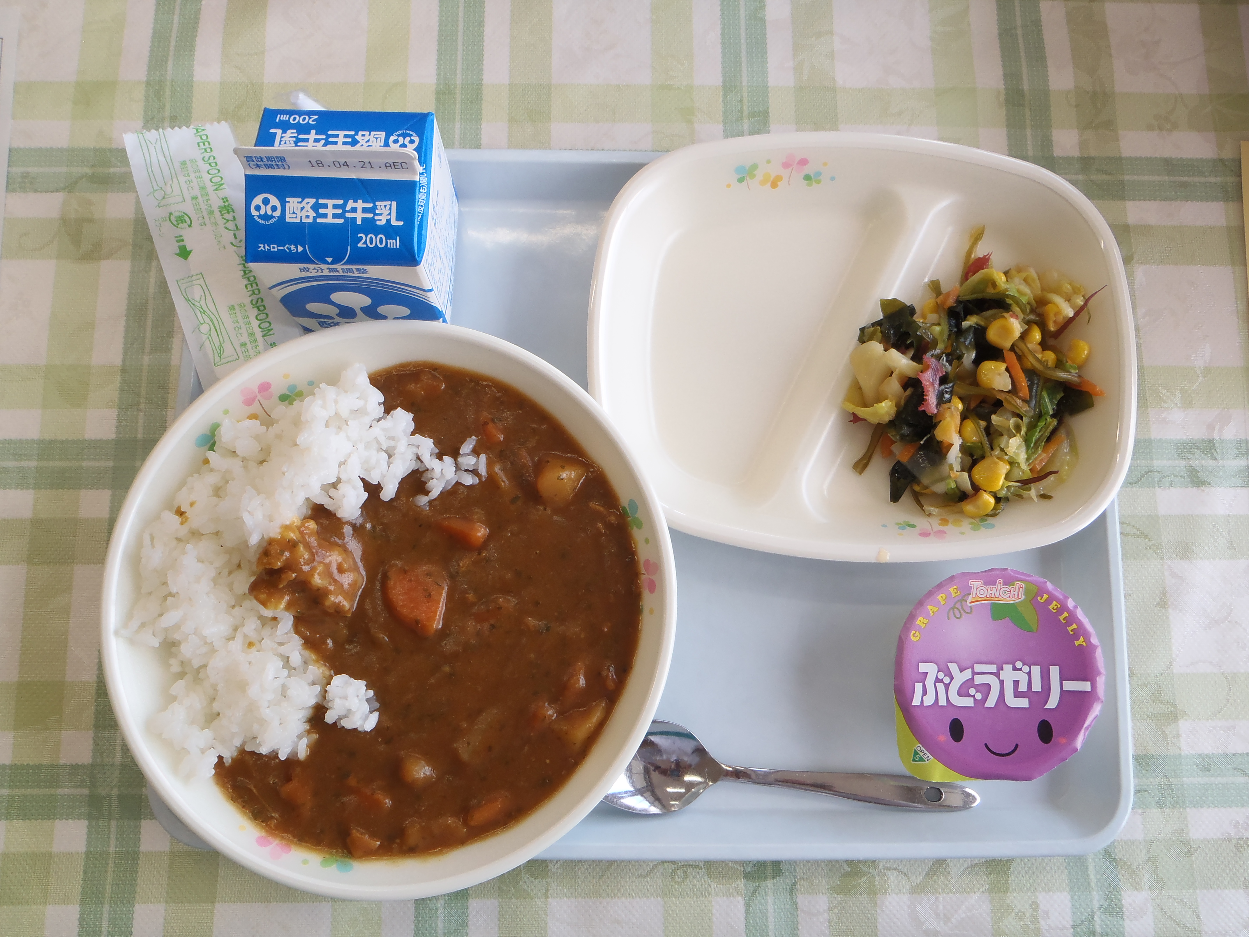 チキンカレー 海藻サラダ ぶどうゼリー 牛乳