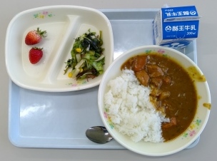 チキンカレーライス 牛乳 海藻サラダ いちご