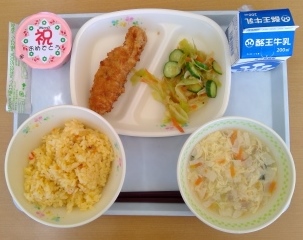 キャロットピラフ 牛乳 メルルーサのガーリックフライ オニオンサラダ 卵スープ お祝い紅白ゼリー