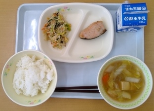 ごはん 牛乳 鮭のごま焼き 五目ビーフン のっぺい汁