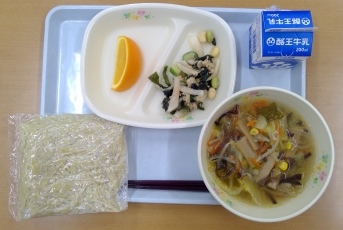 五目タンメン 牛乳 豆まめサラダ オレンジ