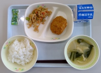 ごはん 牛乳 手作りコロッケ パックソース レンコンのきんぴら 青菜のみそ汁