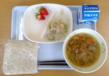 芋煮うどん 牛乳 レンコンサラダ いちご