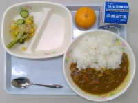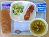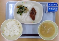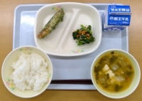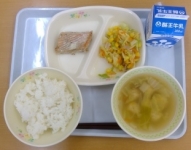 ごはん 牛乳 サケのハーブ焼き 野菜のソテー 剥製と肉団子のスープ