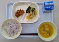 ゆかりごはん 牛乳 鶏のから揚げ 海藻サラダ かぼちゃのみそ汁