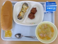 コッペパン 牛乳 マーマレードジャム 五目野菜肉団子 ポテトのチーズ焼き コンソメスープ