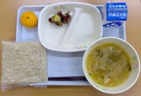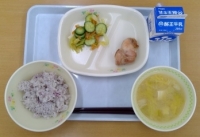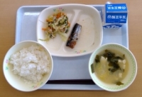 ごはん 牛乳 いわしごま味噌煮 茎わかめのきんぴら 凍み豆腐のみそ汁
